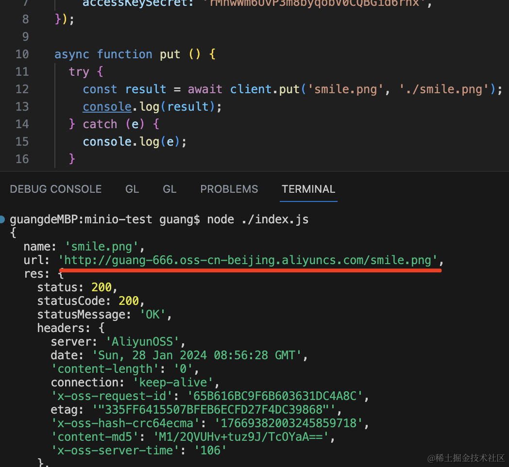 put();填入 region、bucket 和 accessKeyId、accessKeySecret