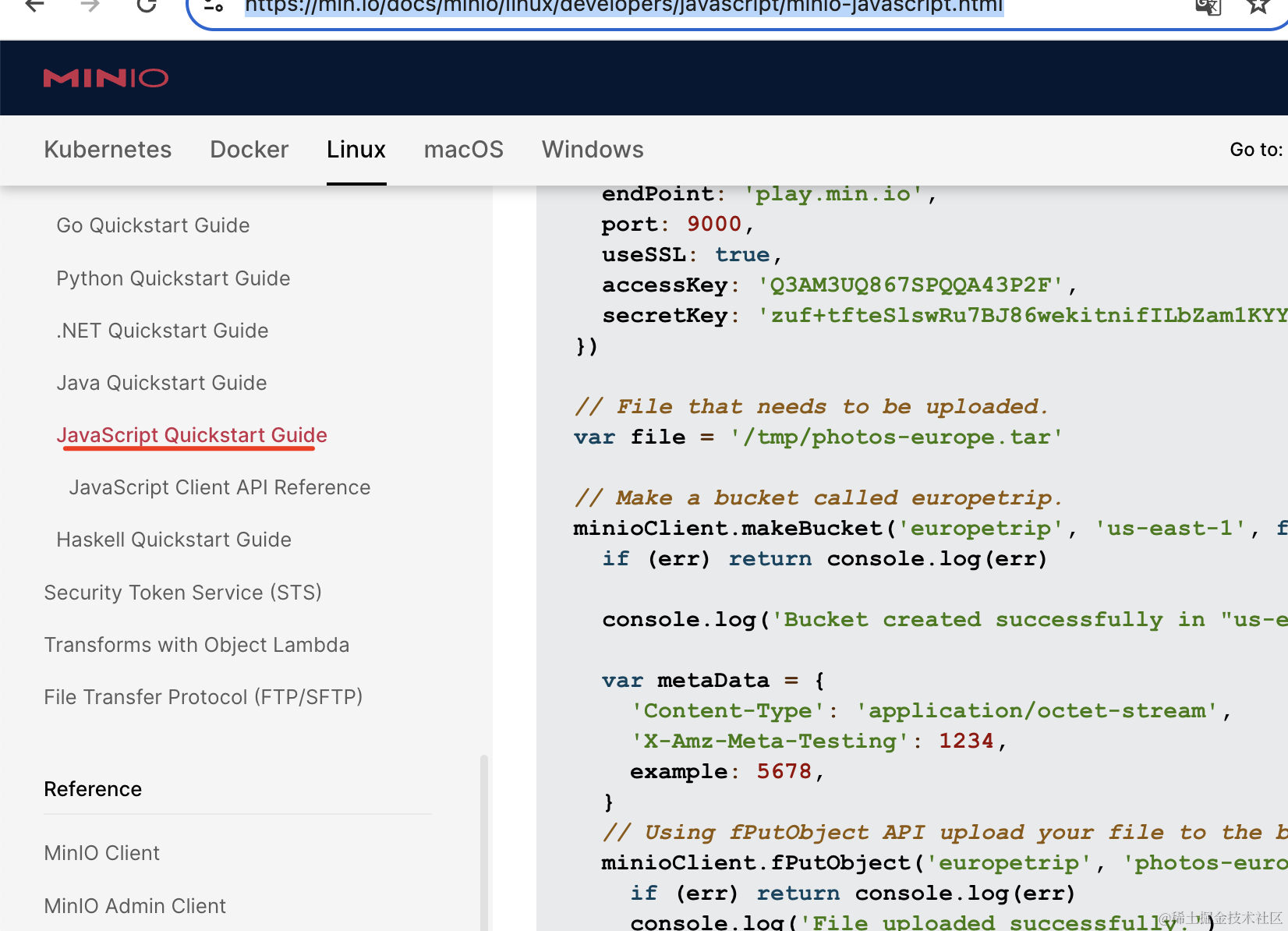 我们用 docker 跑了一个 minio 的容器,然后分别在管理界面和用 npm 包的方式做了文件上传和下载。