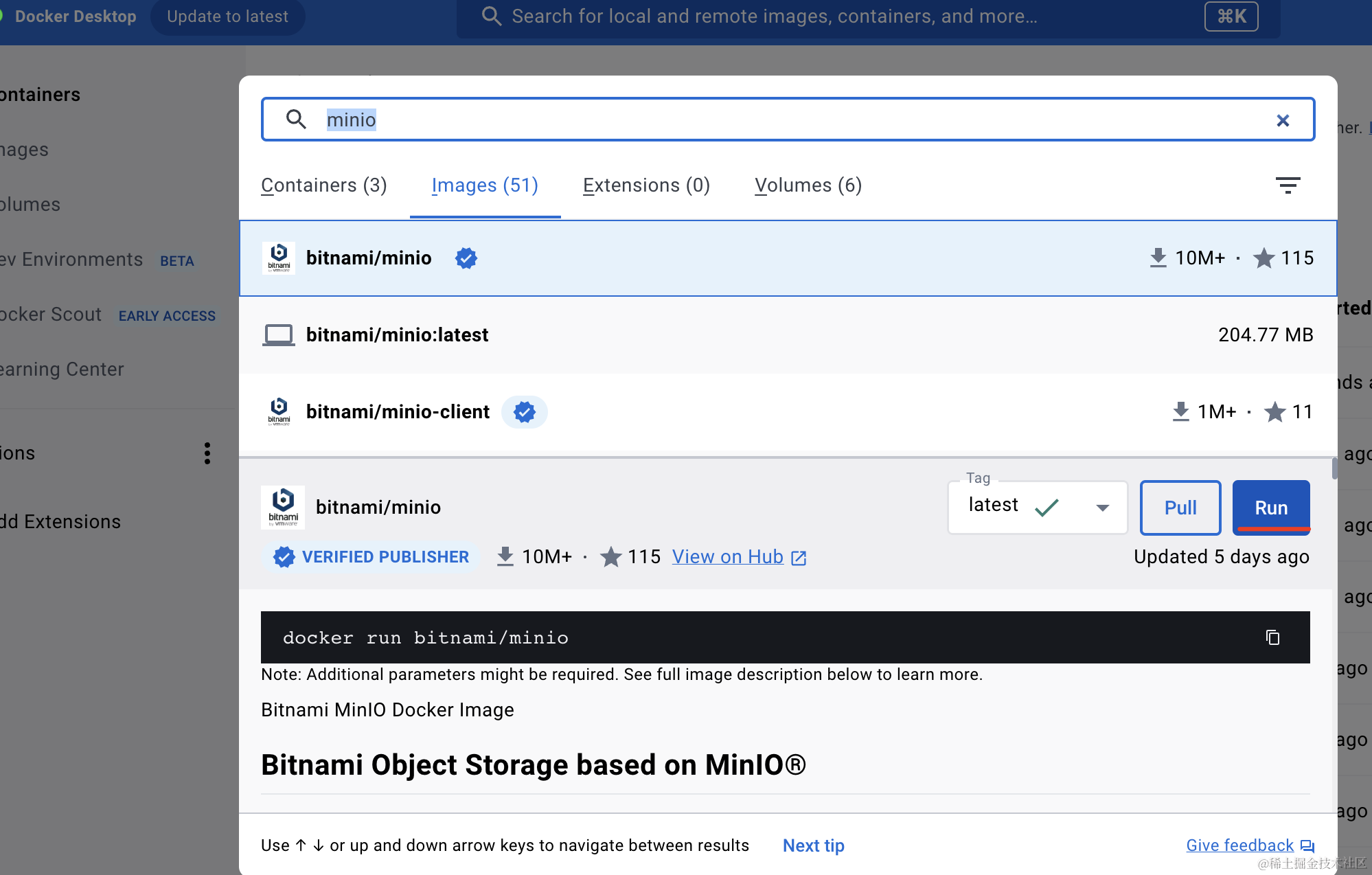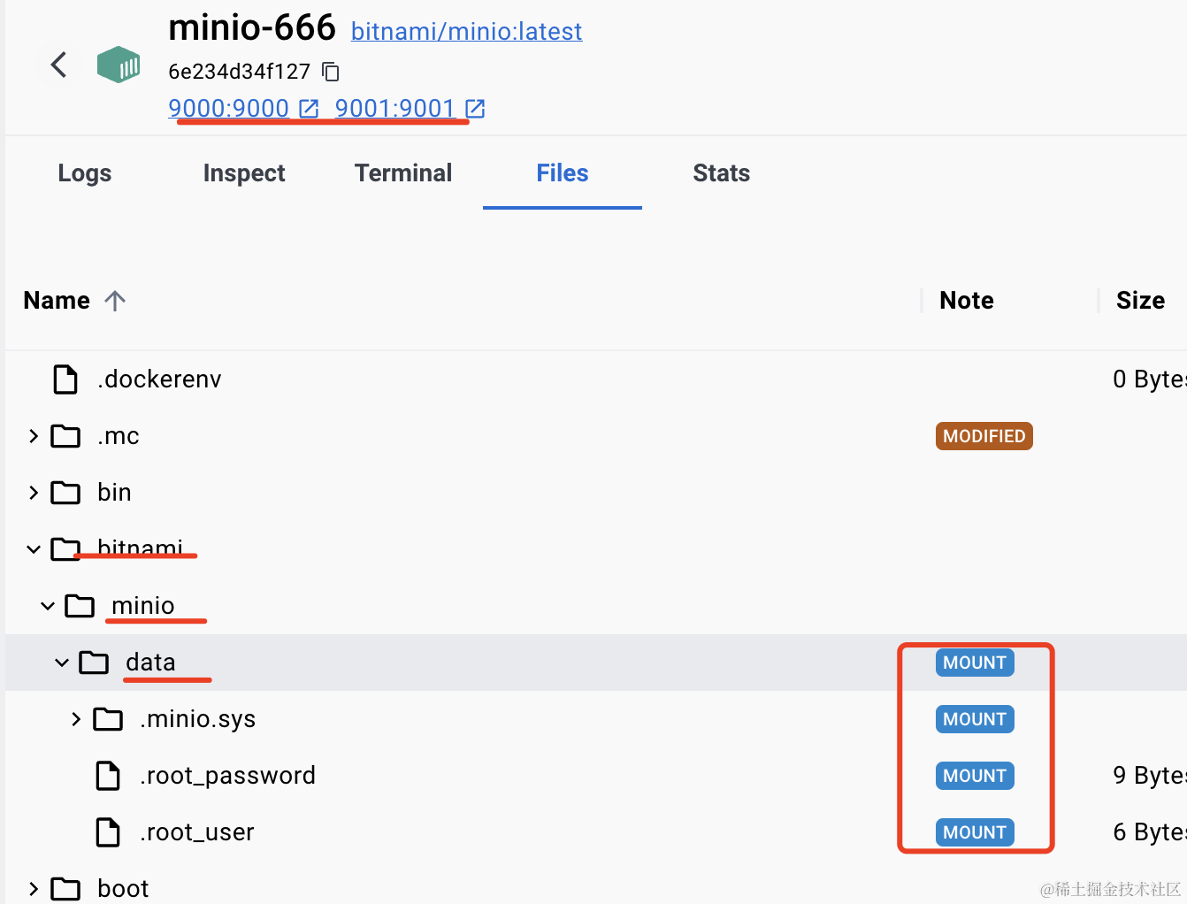 这里挂载了一个本地一个目录到容器内的数据目录 /bitnami/minio/data,这样容器里的各种数据都保存在本地了。