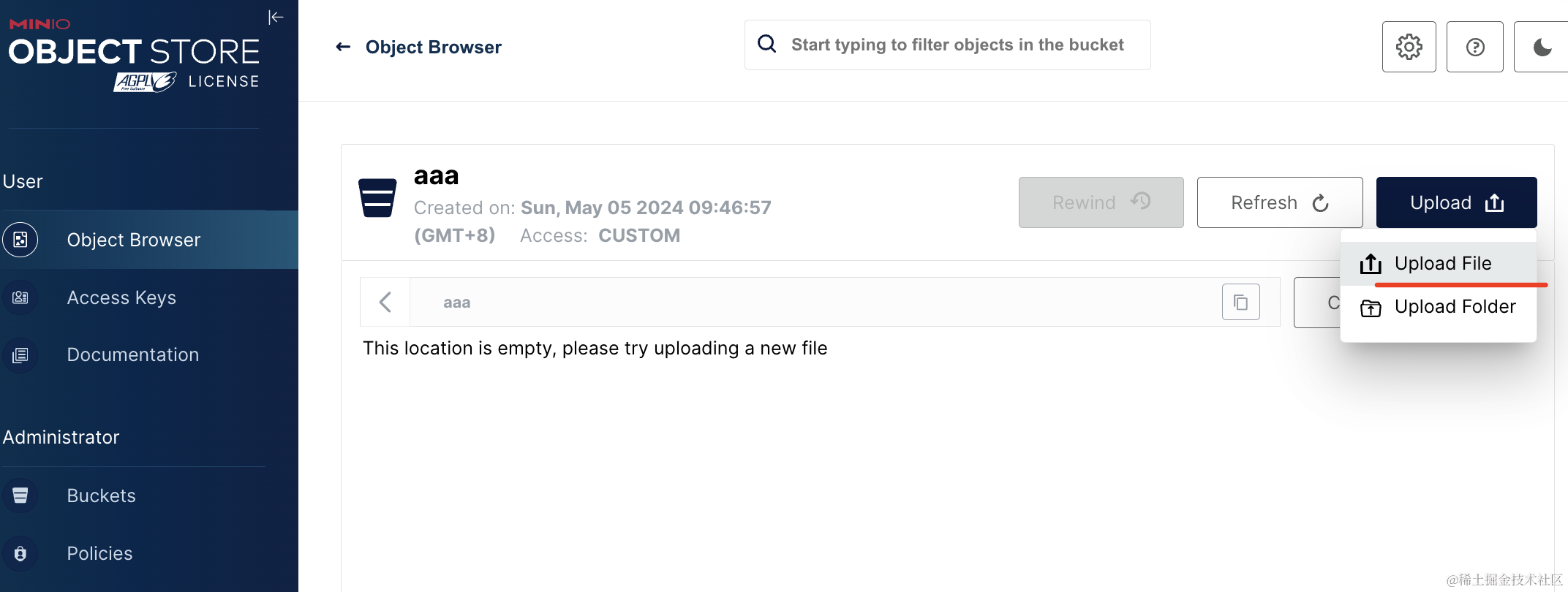 bucketName 是 aaa,而 objectName 需要文件上传的时候拿到 file.name 作为参数传过来。