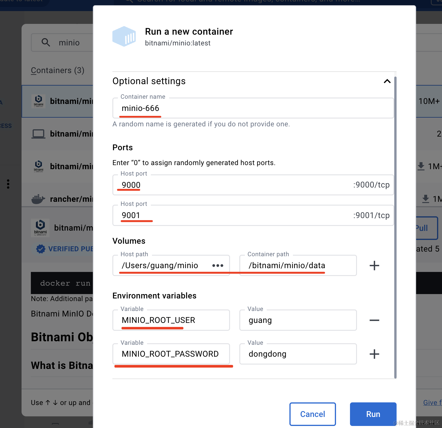 还要指定两个环境变量,MINIO_ROOT_USER 和 MINIO_ROOT_PASSWORD,是用来登录的。