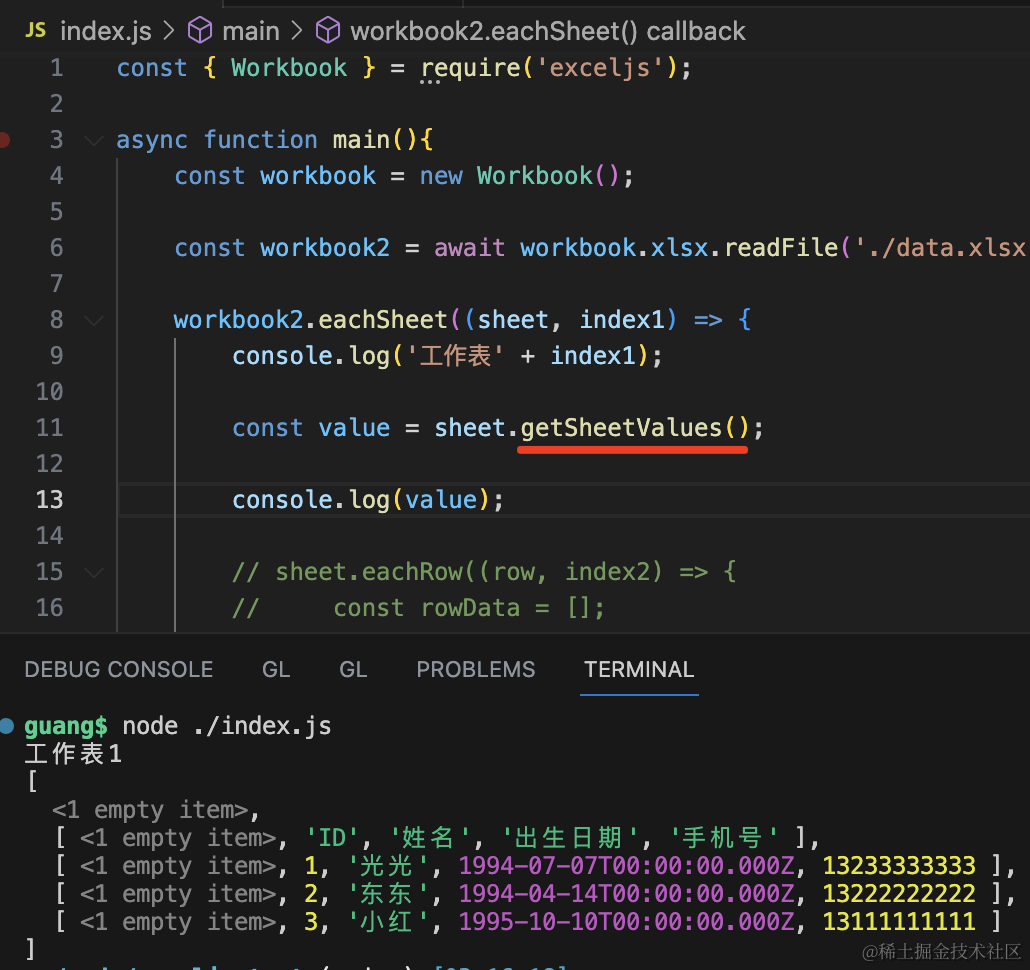 exceljs 还提供了简便的方法,可以直接调用 worksheet 的 getSheetValues 来拿到表格数据,不用自己遍历: