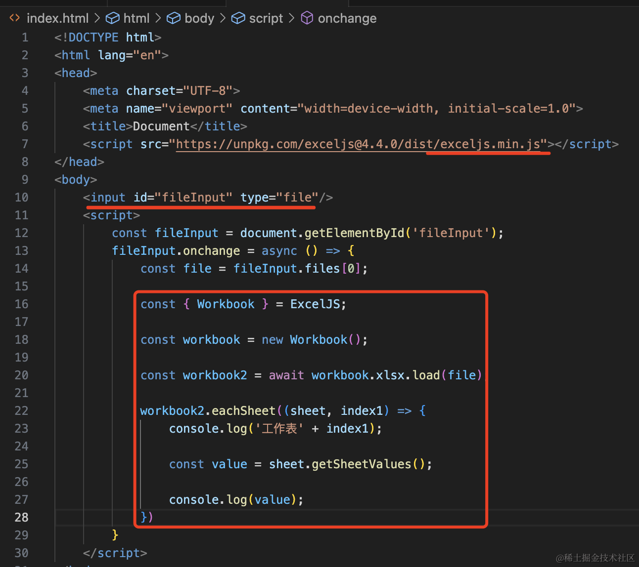 创建 index.html,引入 exceljs 包。