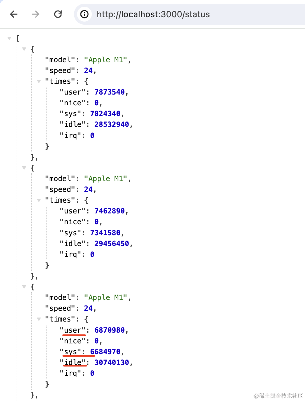 可以看到,times.user、times.sys、times.idle 分别代表用户代码占用的 cpu 时间、系统代码占用的 cpu 时间,空闲的 cpu 时间: