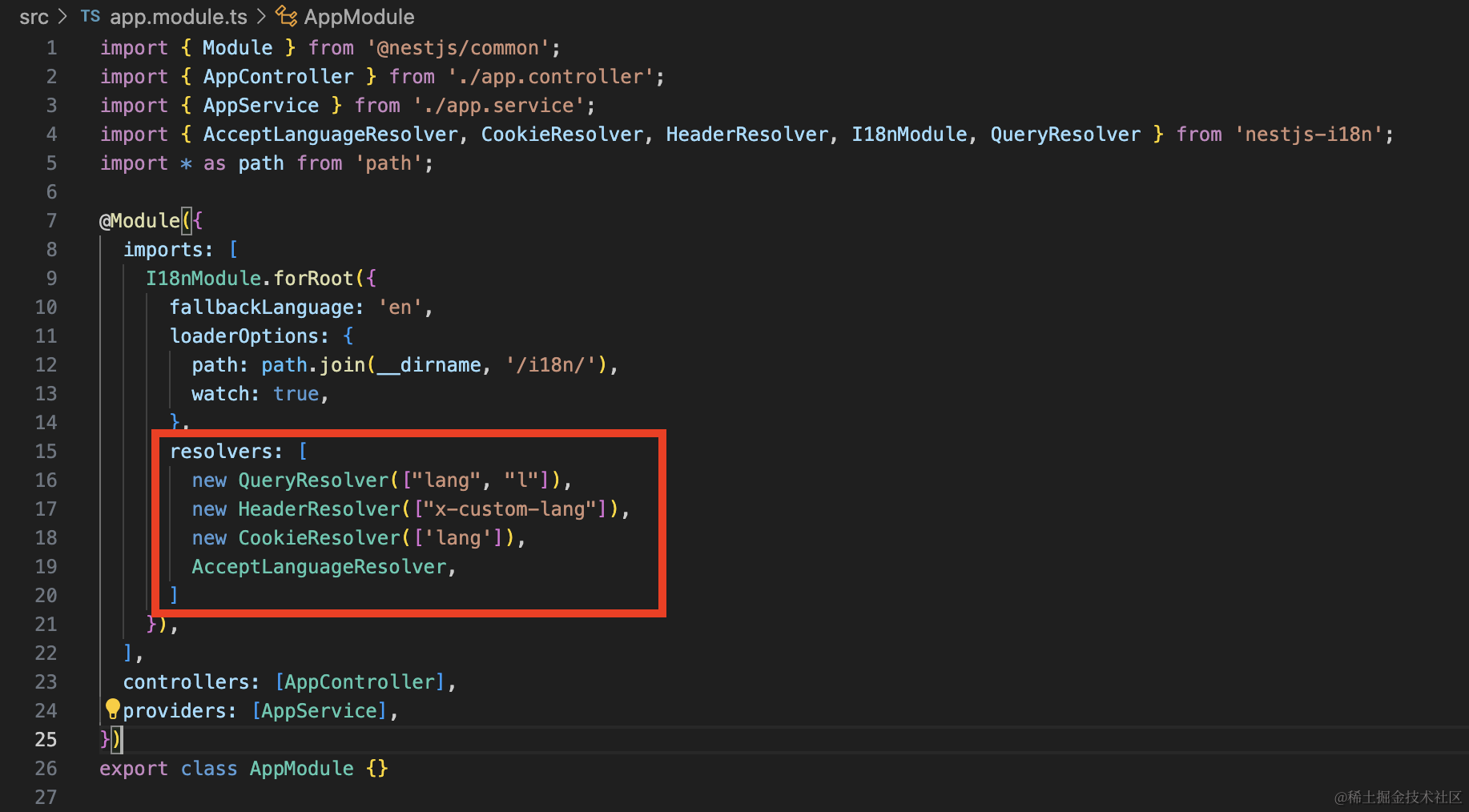 nest 里我们用 nestjs-i18n 这个包,在 AppModule 里引入 I18nModule,指定资源包的路径,resolver(取 lang 配置的方式)。