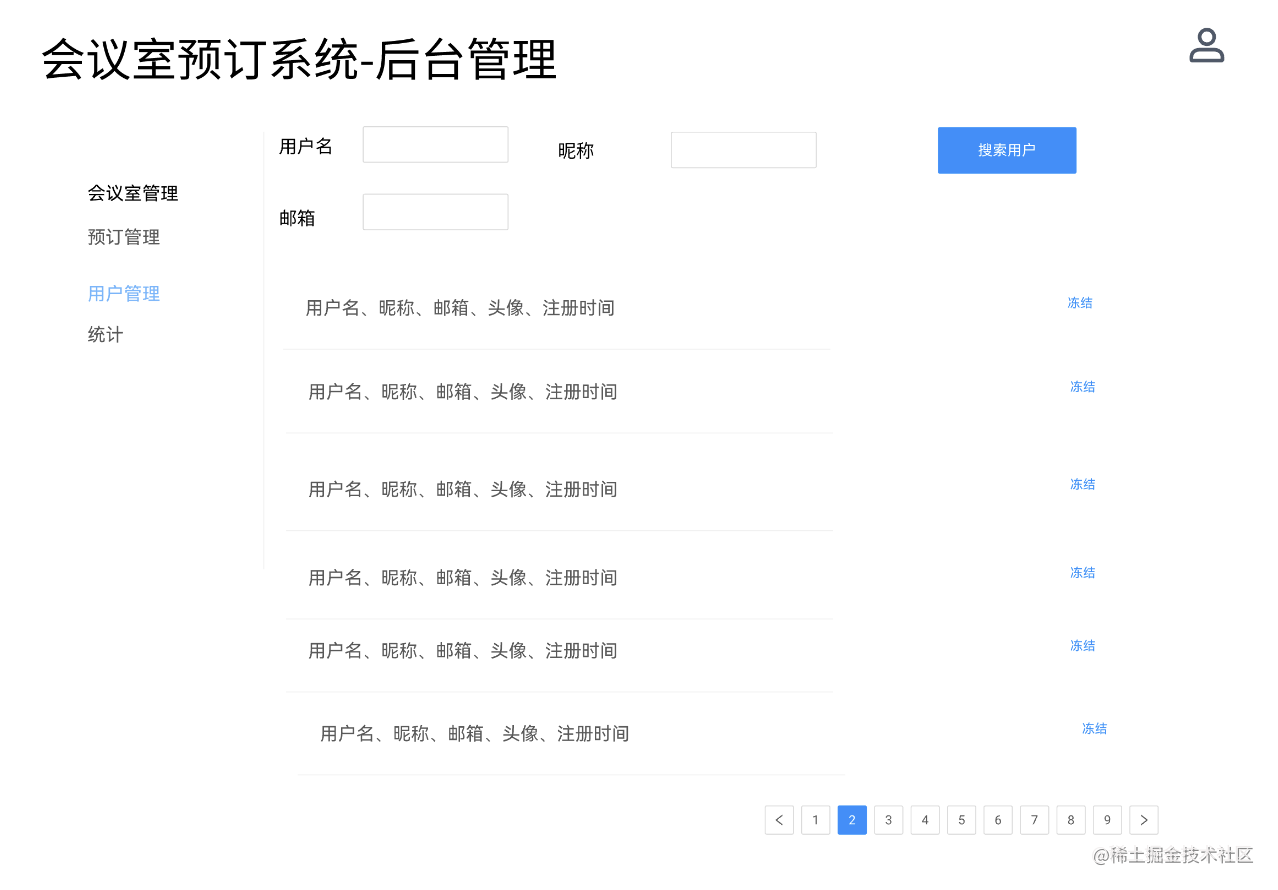 管理员可以查看用户信息、冻结用户。冻结状态的用户不能预订会议室。