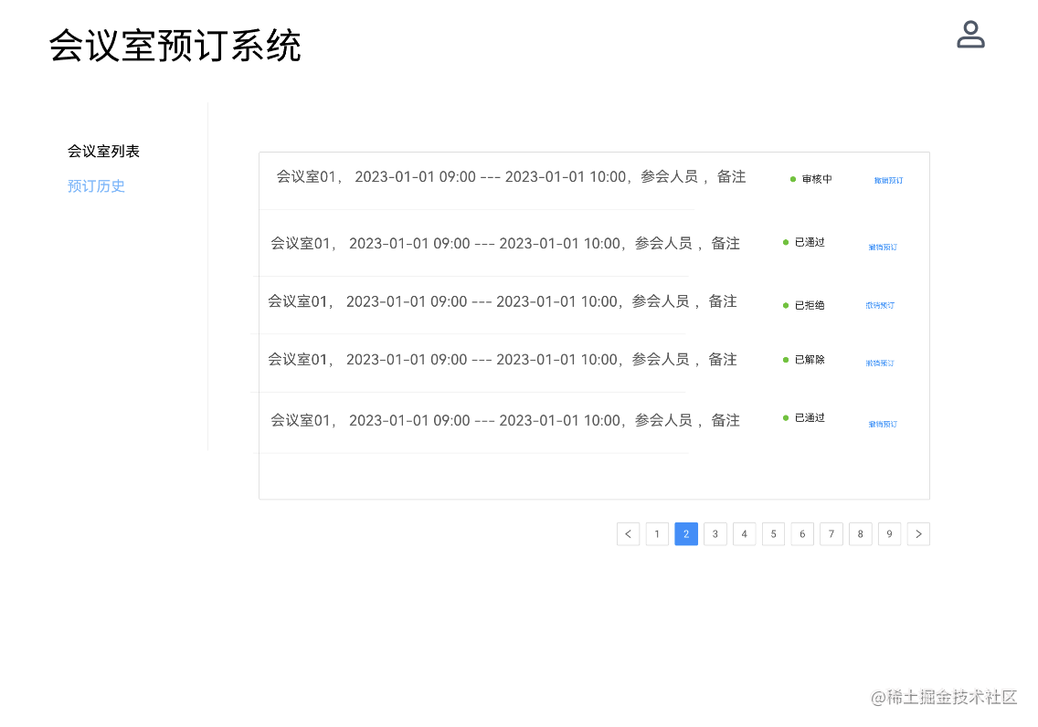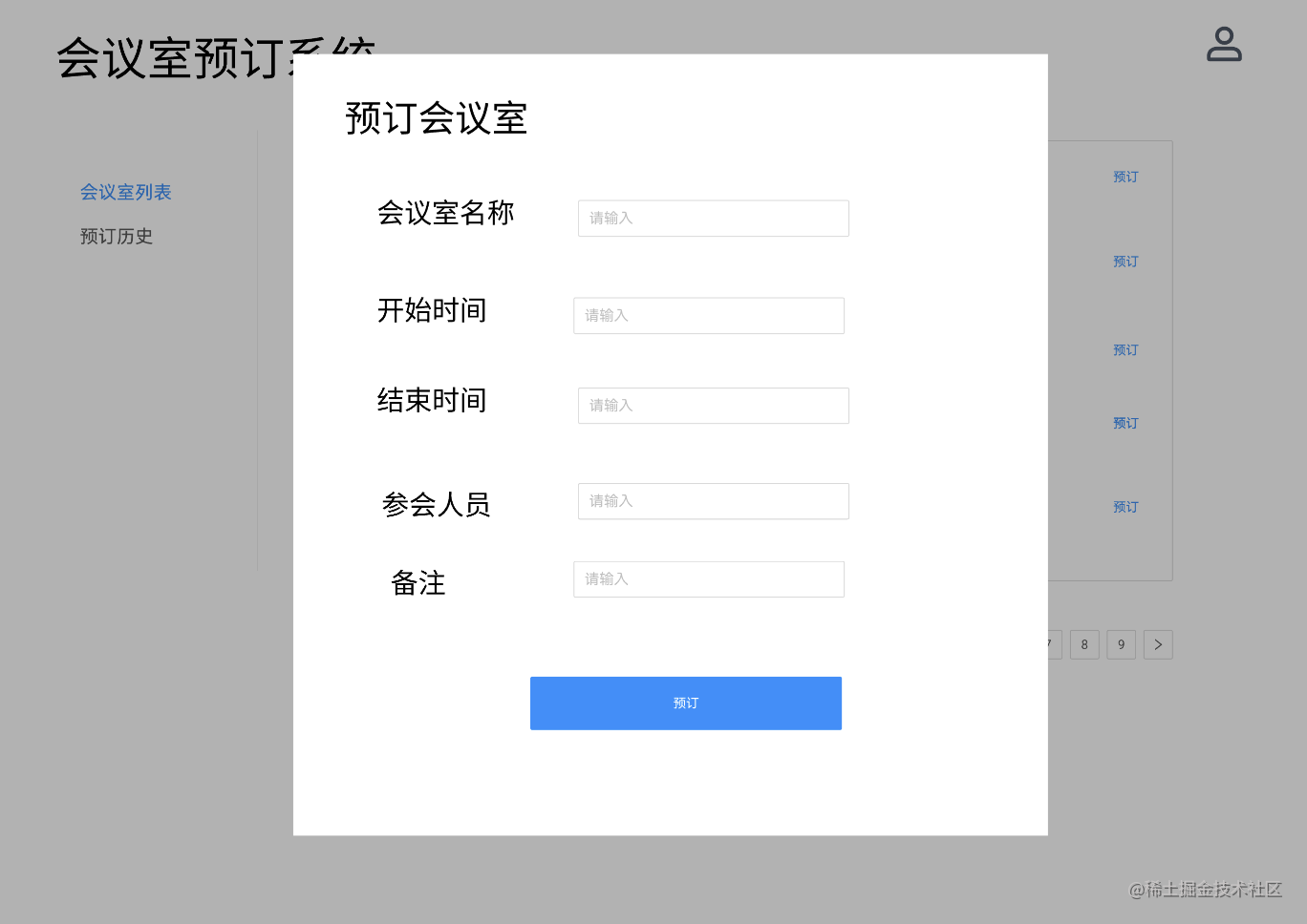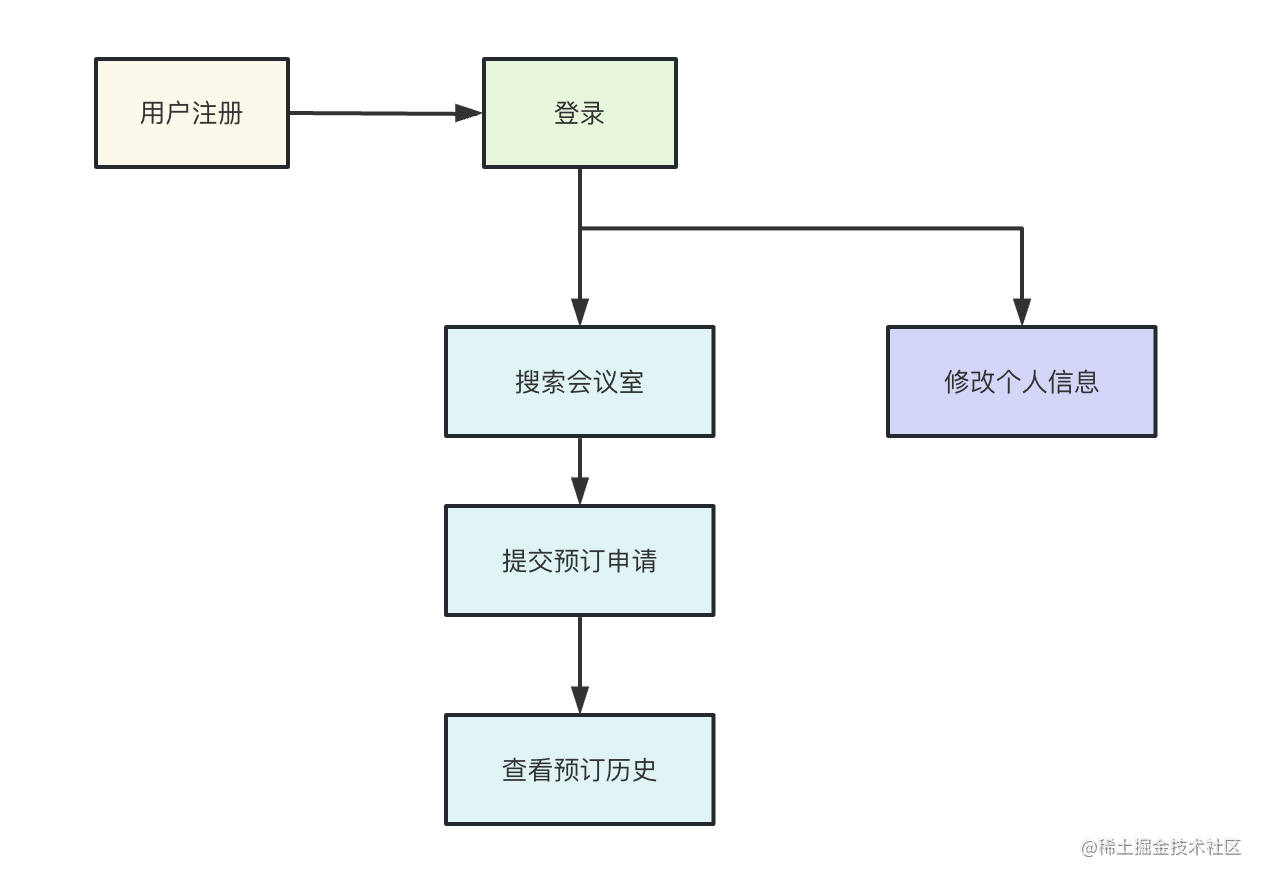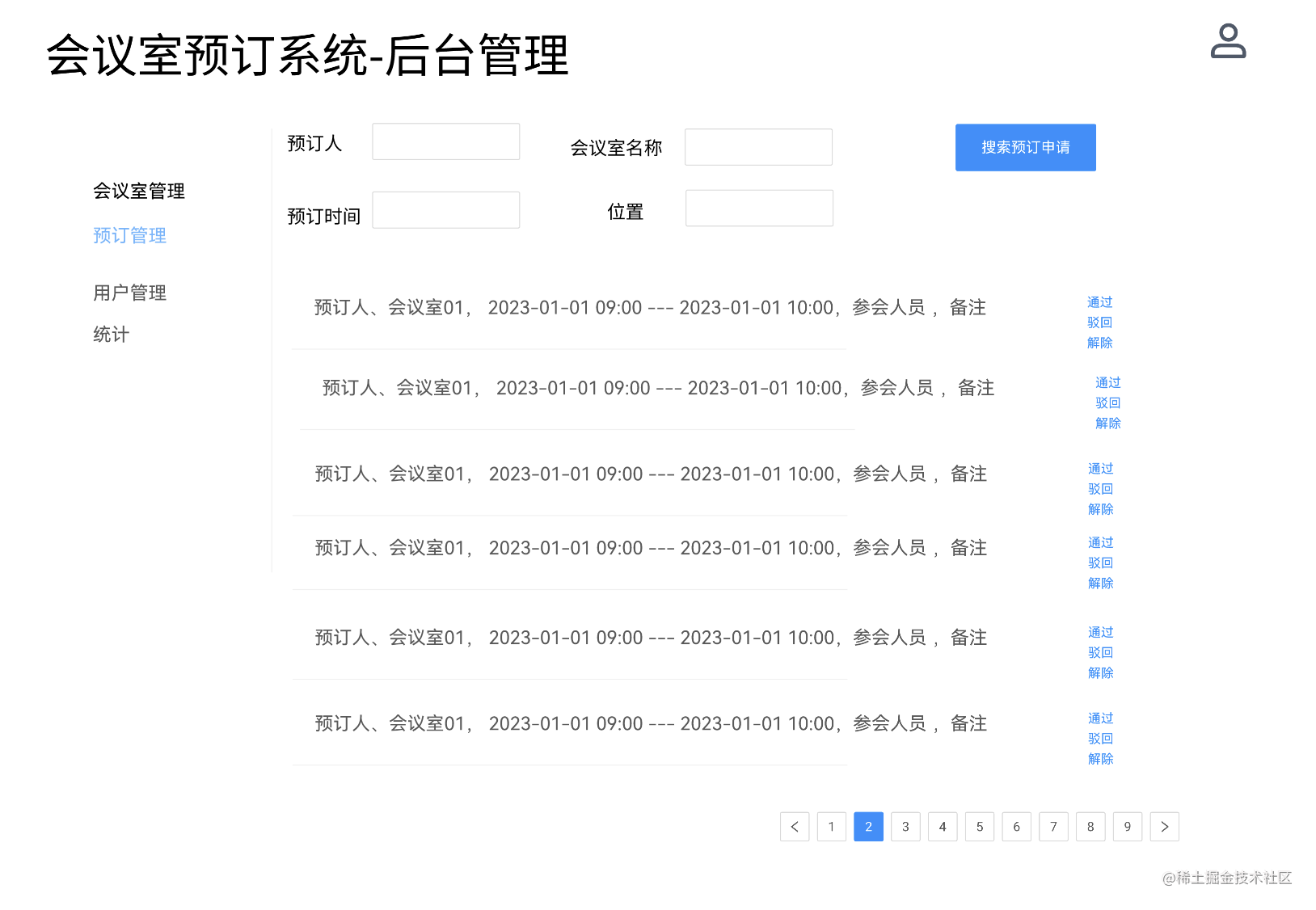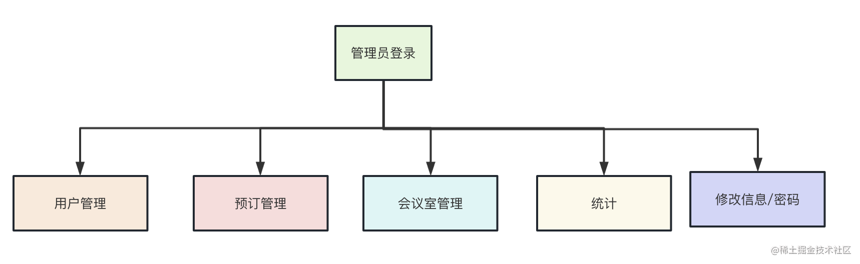 整体分为用户管理、会议室管理、预订管理、统计这 4 部分。