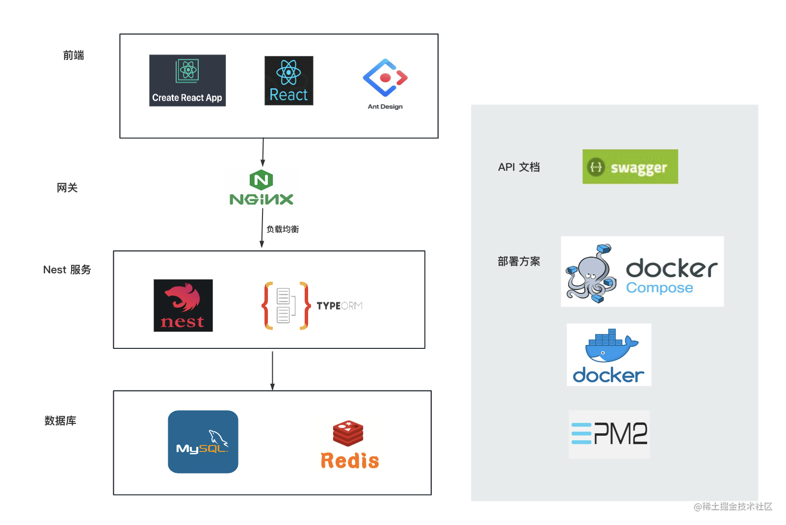 技术栈:前端是 antd + react + cra,后端是 nest + typeorm,数据库是 mysql + redis,API 文档用 swagger 生成,部署用 docker compose + pm2,网关使用 nginx。