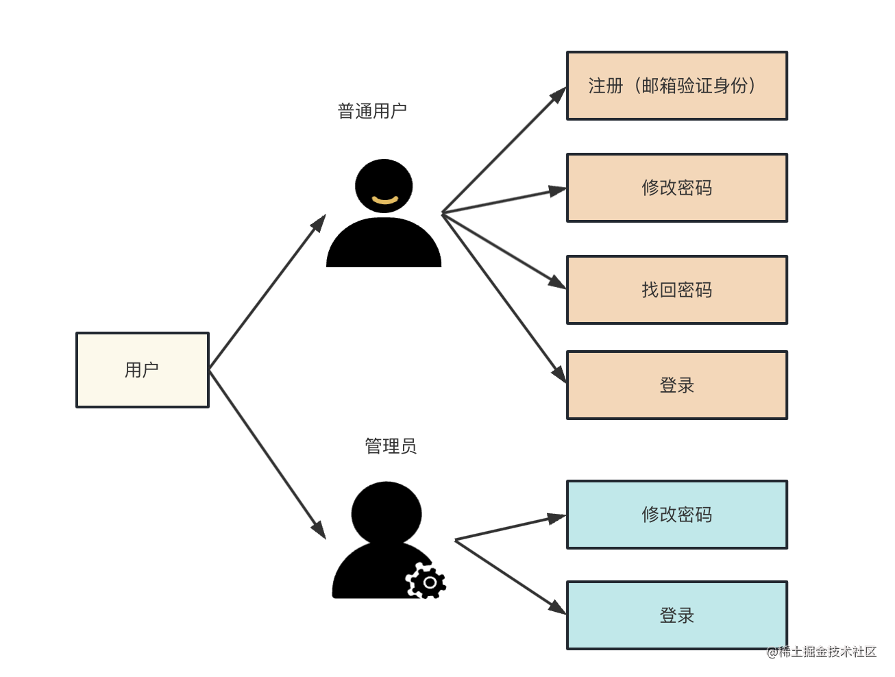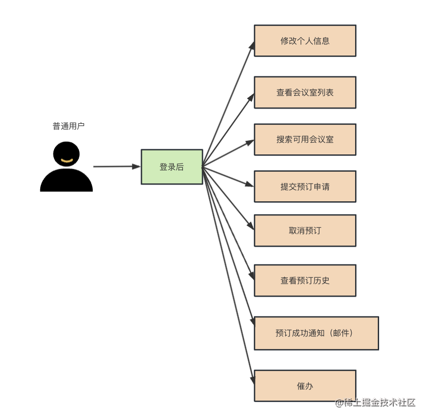 角色有两个:普通用户、管理员,各自拥有的权限按照用例图来。使用 RBAC 来控制接口访问权限。