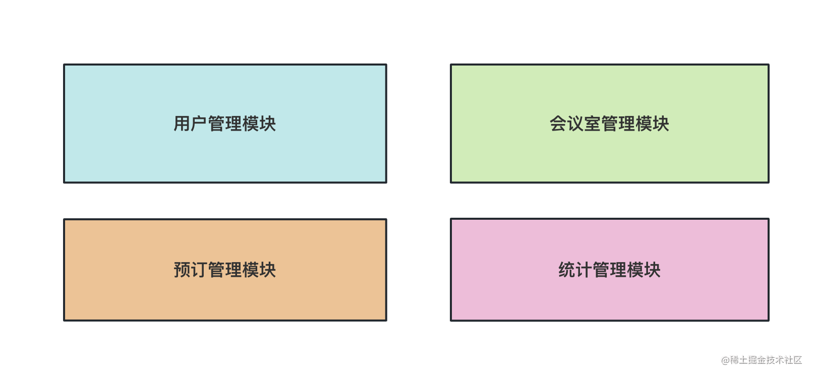 模块有 4 个:用户管理模块、会议室管理模块、预订管理模块、统计管理模块。