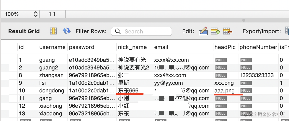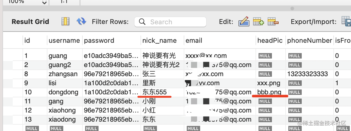 并且给 username 加上了唯一约束,通过 username 来查询用户,然后修改。