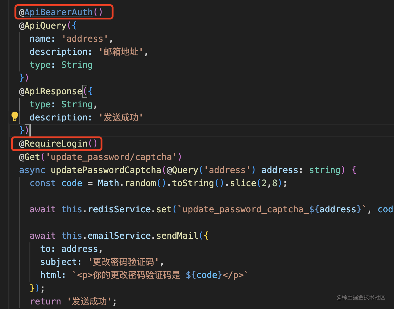 }还有,发送验证码接口的 @RequireLogin 和 @ApiBearerAuth 也要去掉: