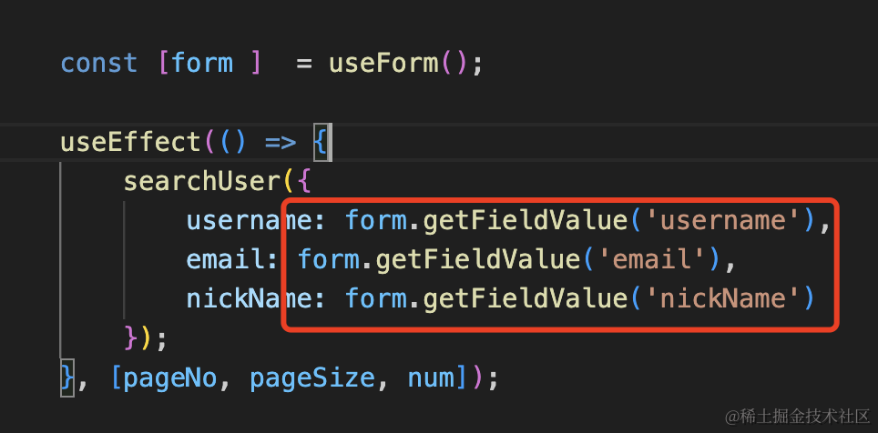 然后在搜索的时候拿到最新的表单值: