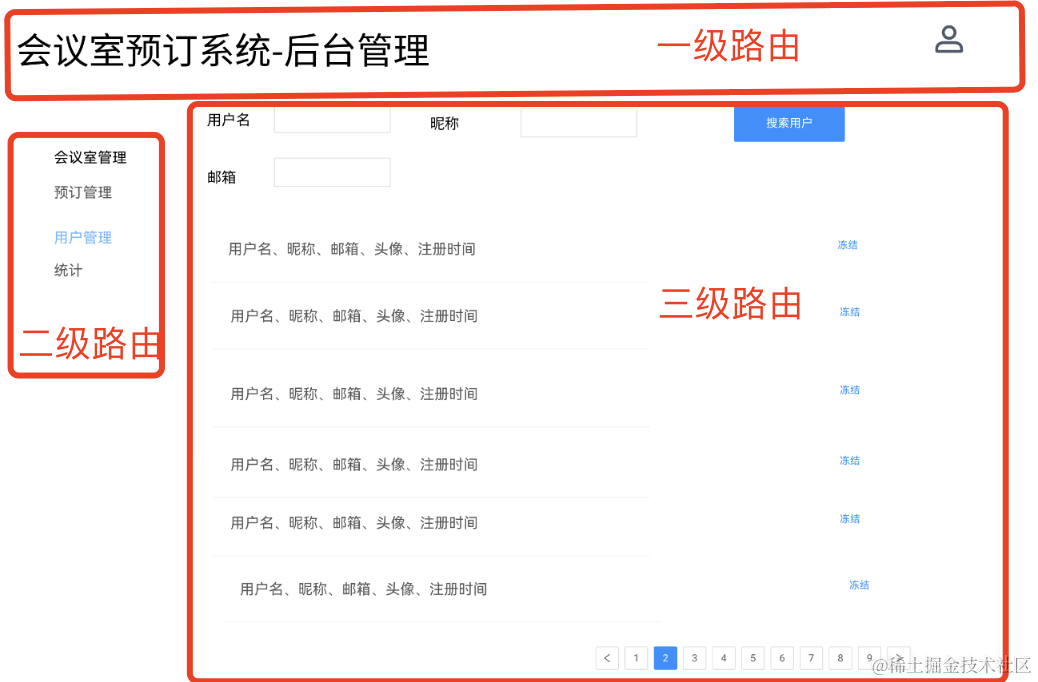 这里涉及到三级路由,第一级展示上面的 header,第二级展示左侧的 menu,第三级才是具体的页面。