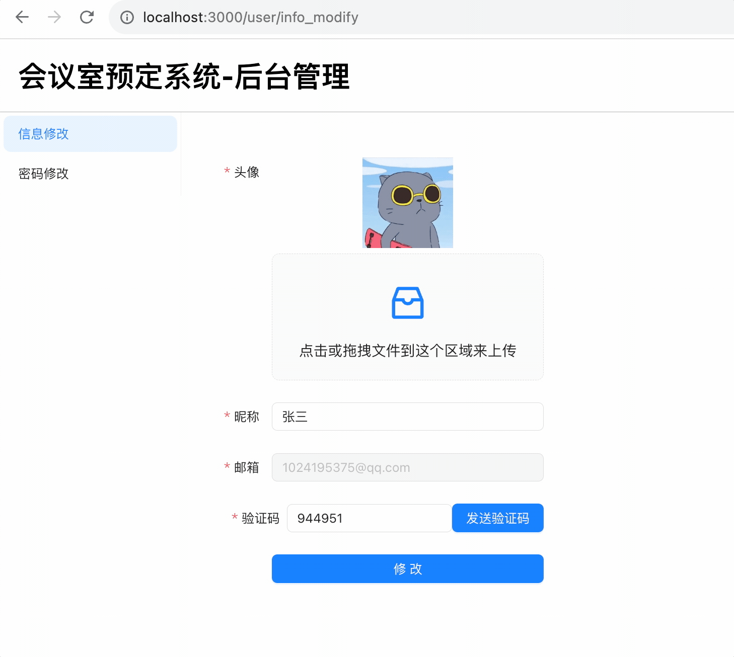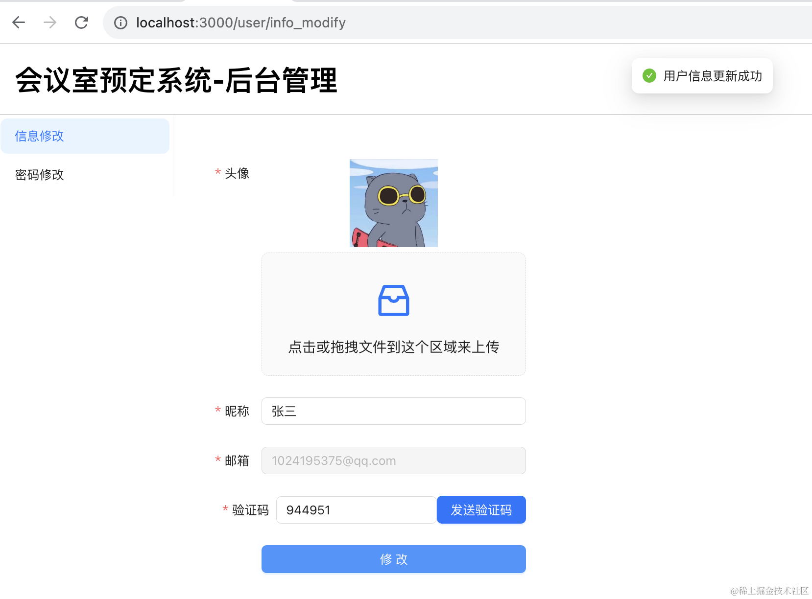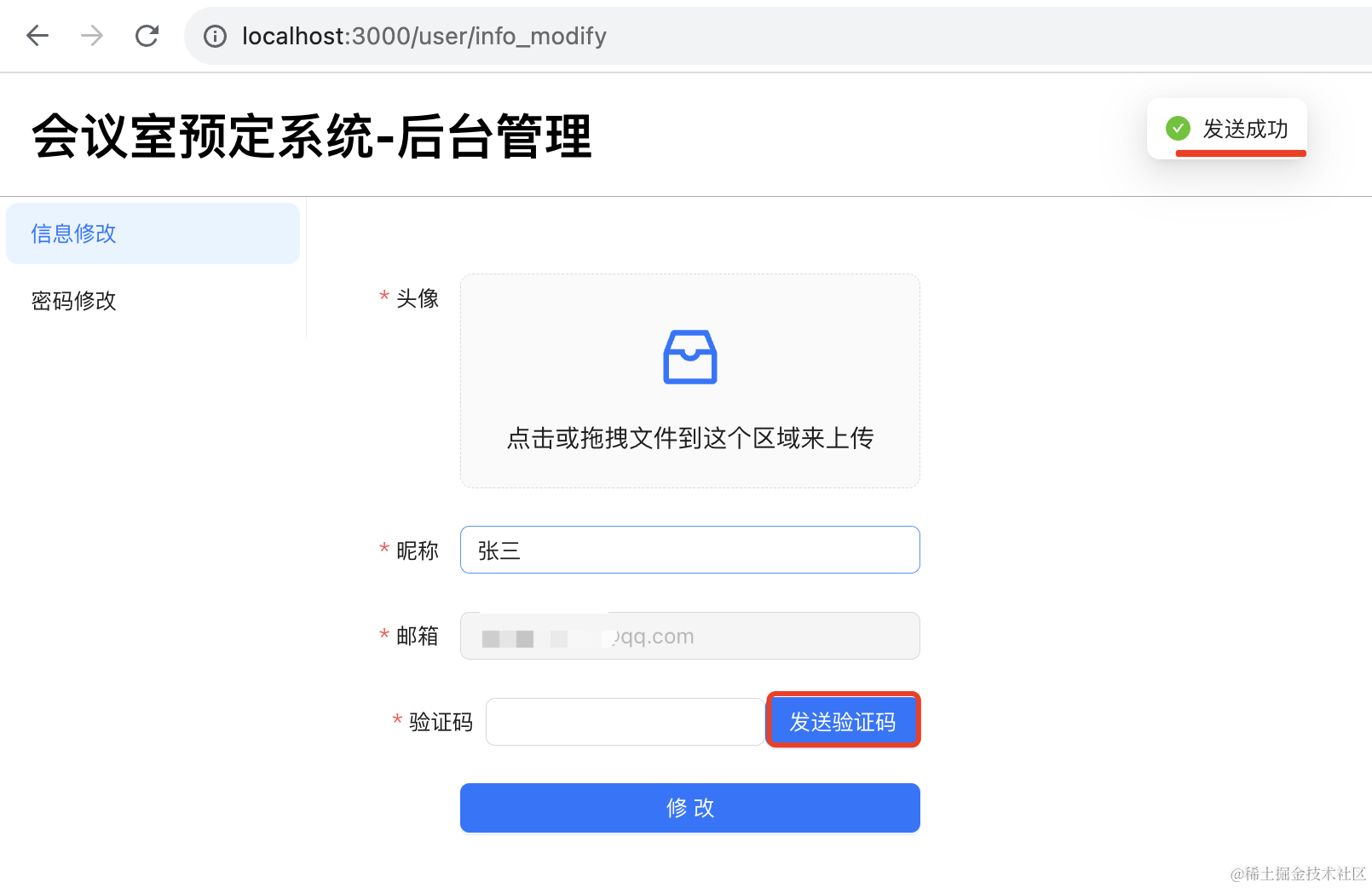 }, []);上传头像,点击发送验证码,填入收到的验证码,点击修改: