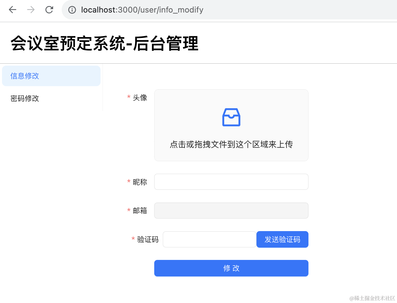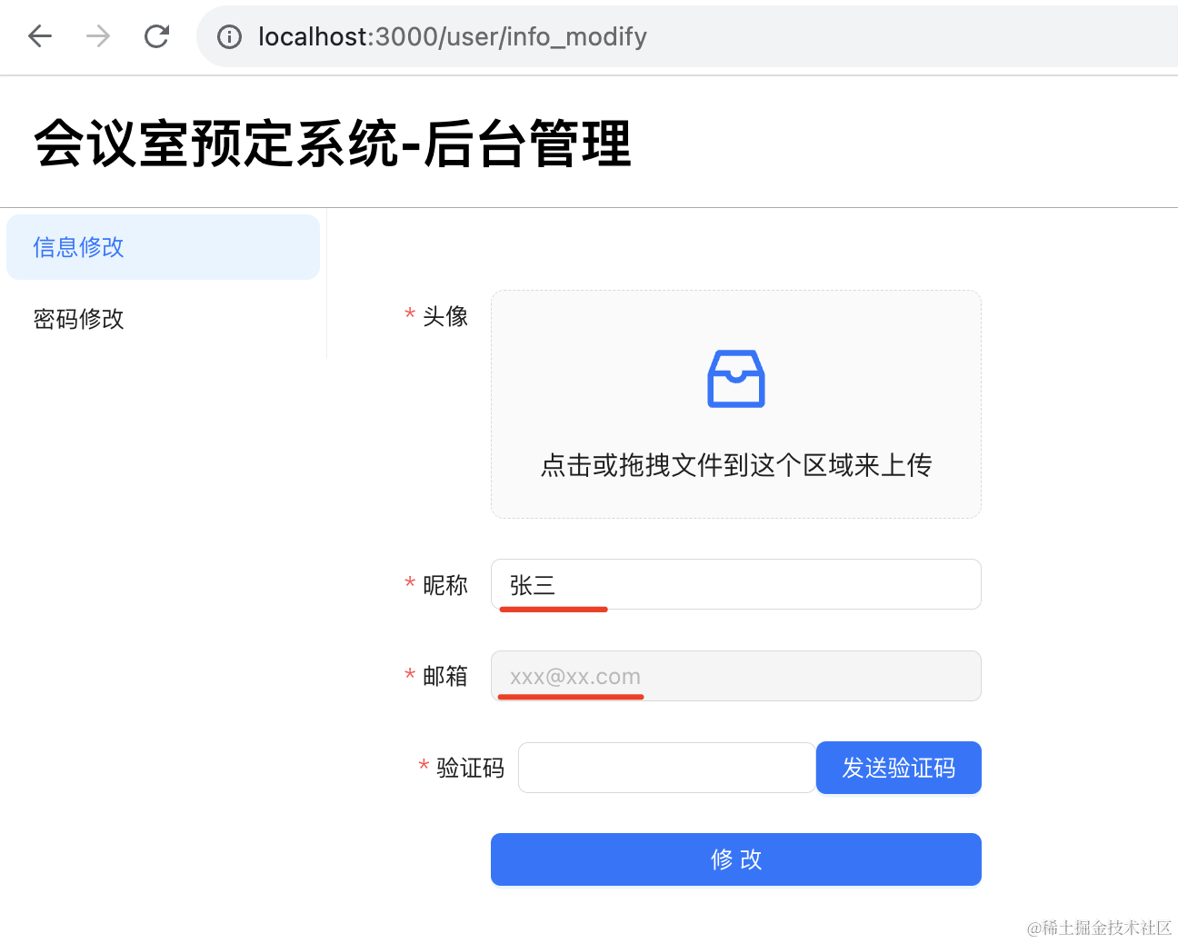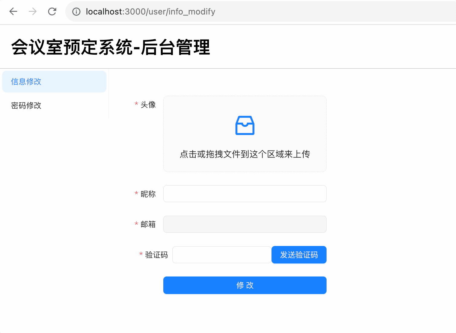 }, []);上传头像,点击发送验证码,填入收到的验证码,点击修改: