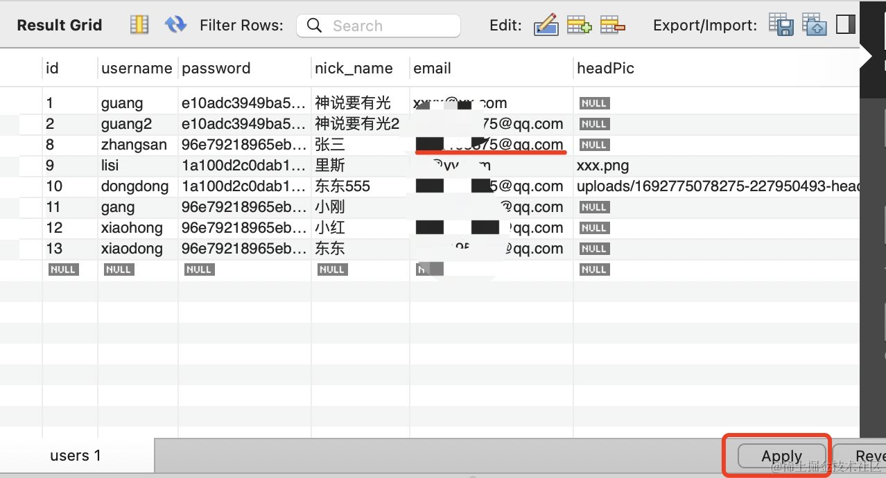 }, []);不过现在的邮箱地址不是真实的,我们手动去数据库里改一下: