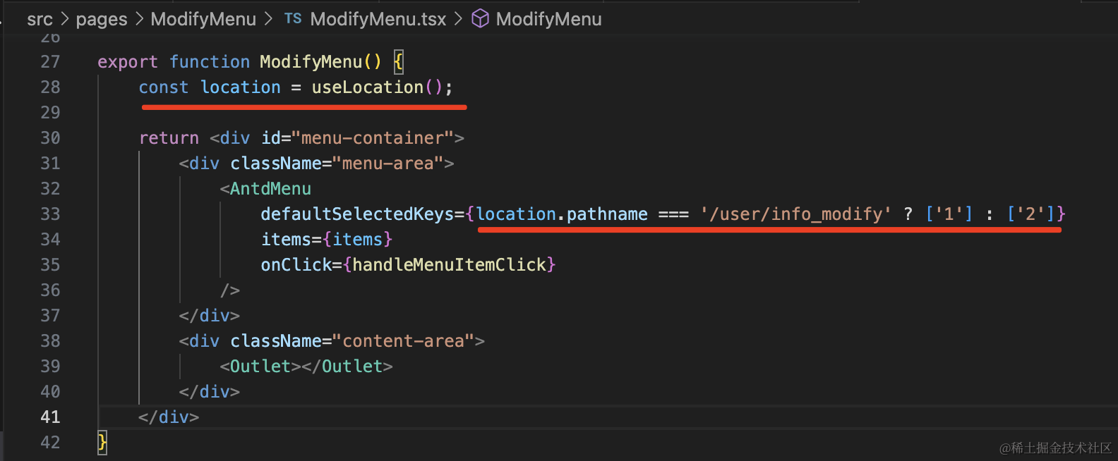 这里用到了 react-router 的 useLocation 的 hook 来拿到当前地址: