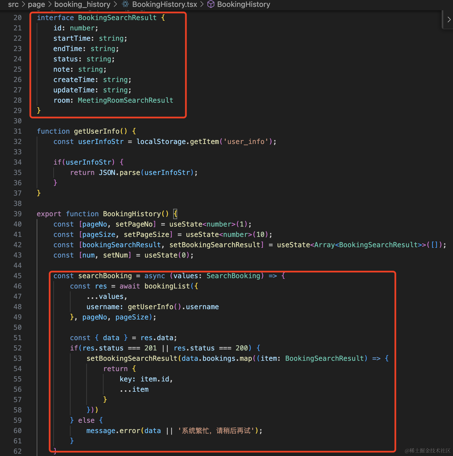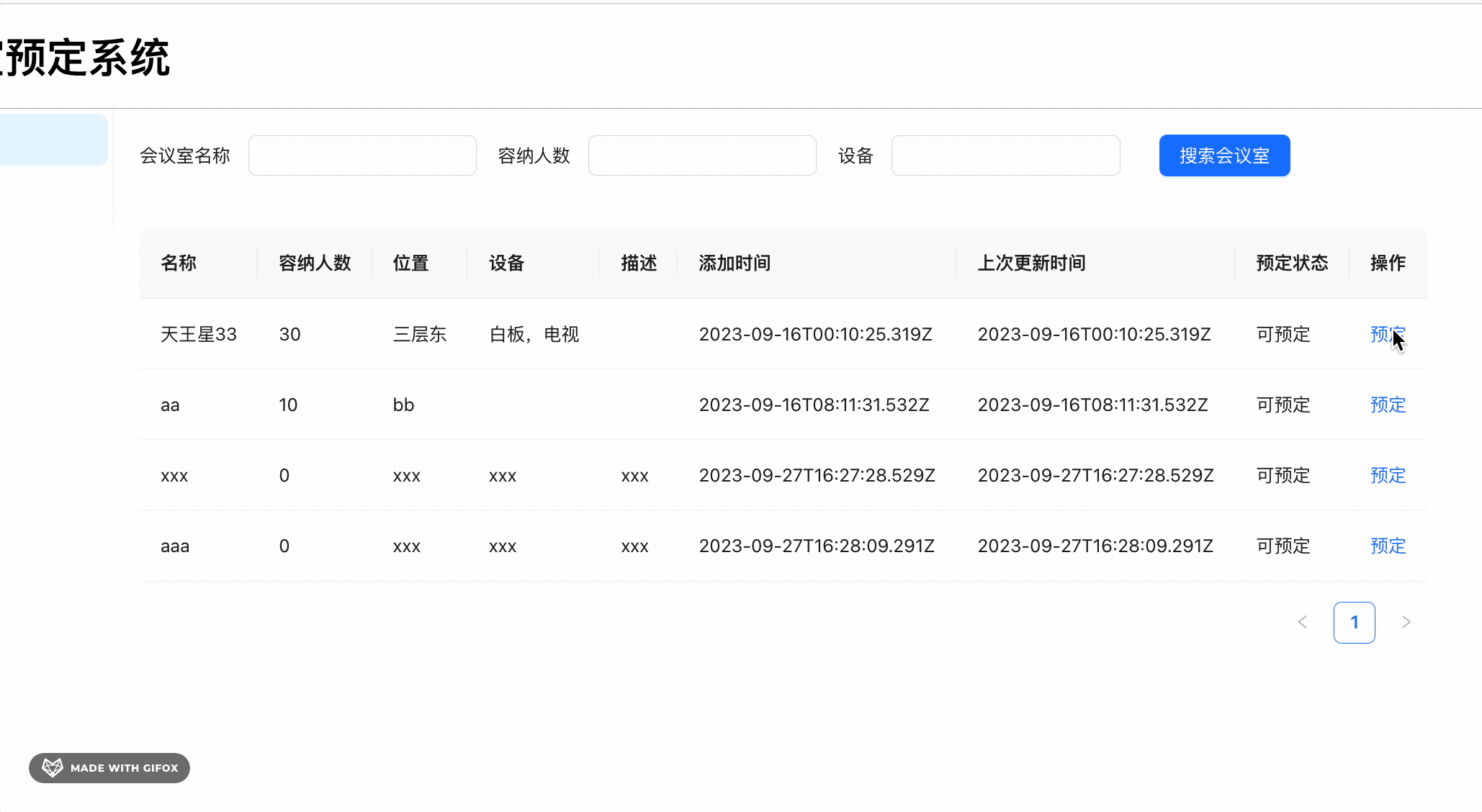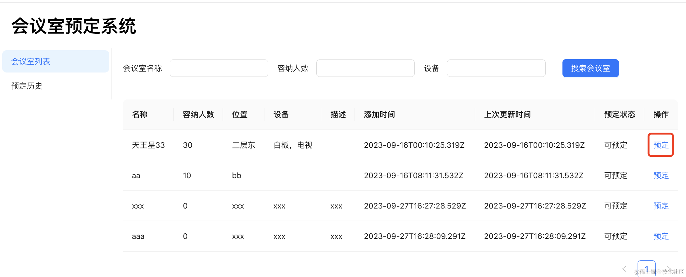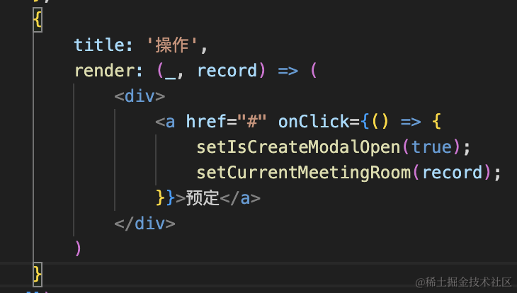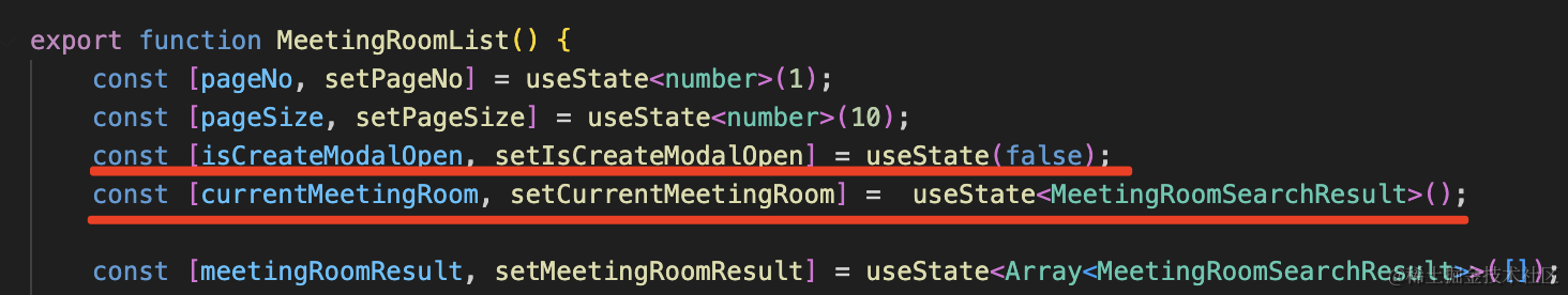 const [currentMeetingRoom, setCurrentMeetingRoom] = useState<MeetingRoomSearchResult>();点击预定按钮的时候,打开弹窗,记录当前会议室: