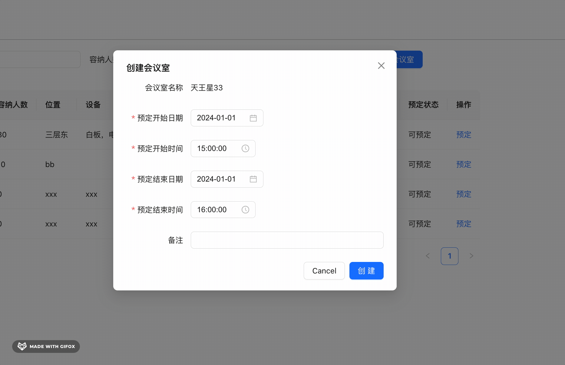 当点击会议室列表的预定按钮的时候,会弹出这个窗口。