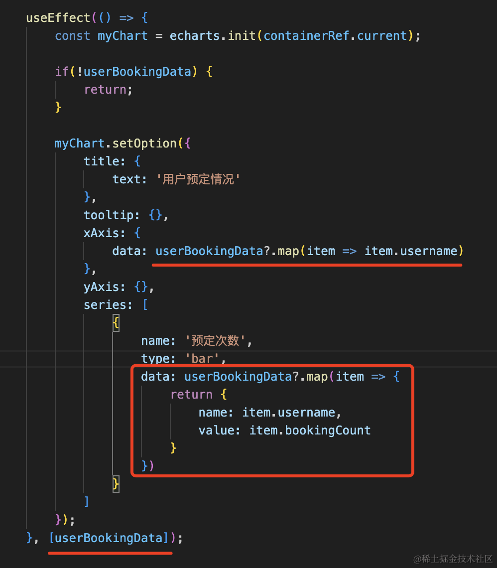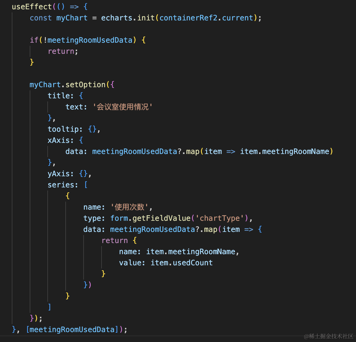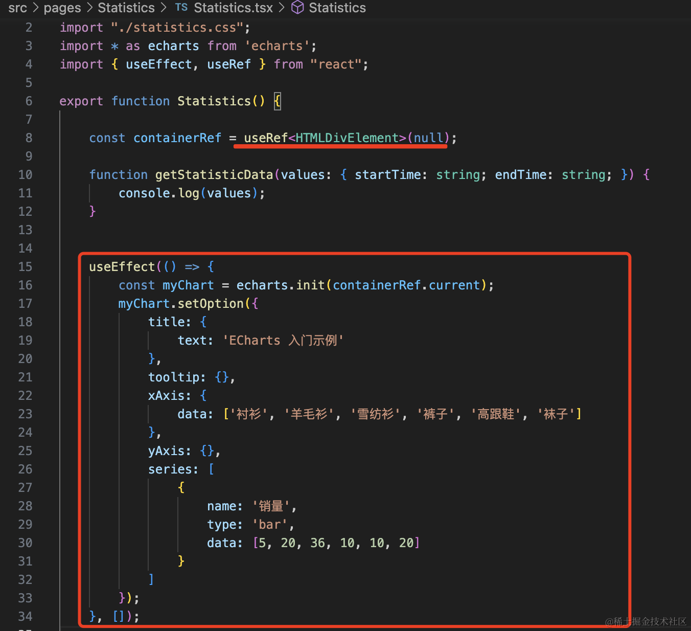 npm install echarts --save然后通过 useRef 拿到 dom 元素,再初始化下 echarts 的柱状图: