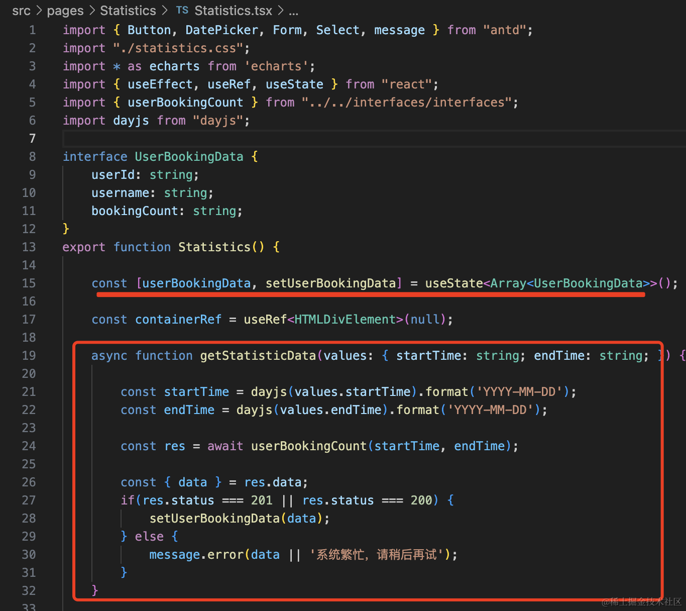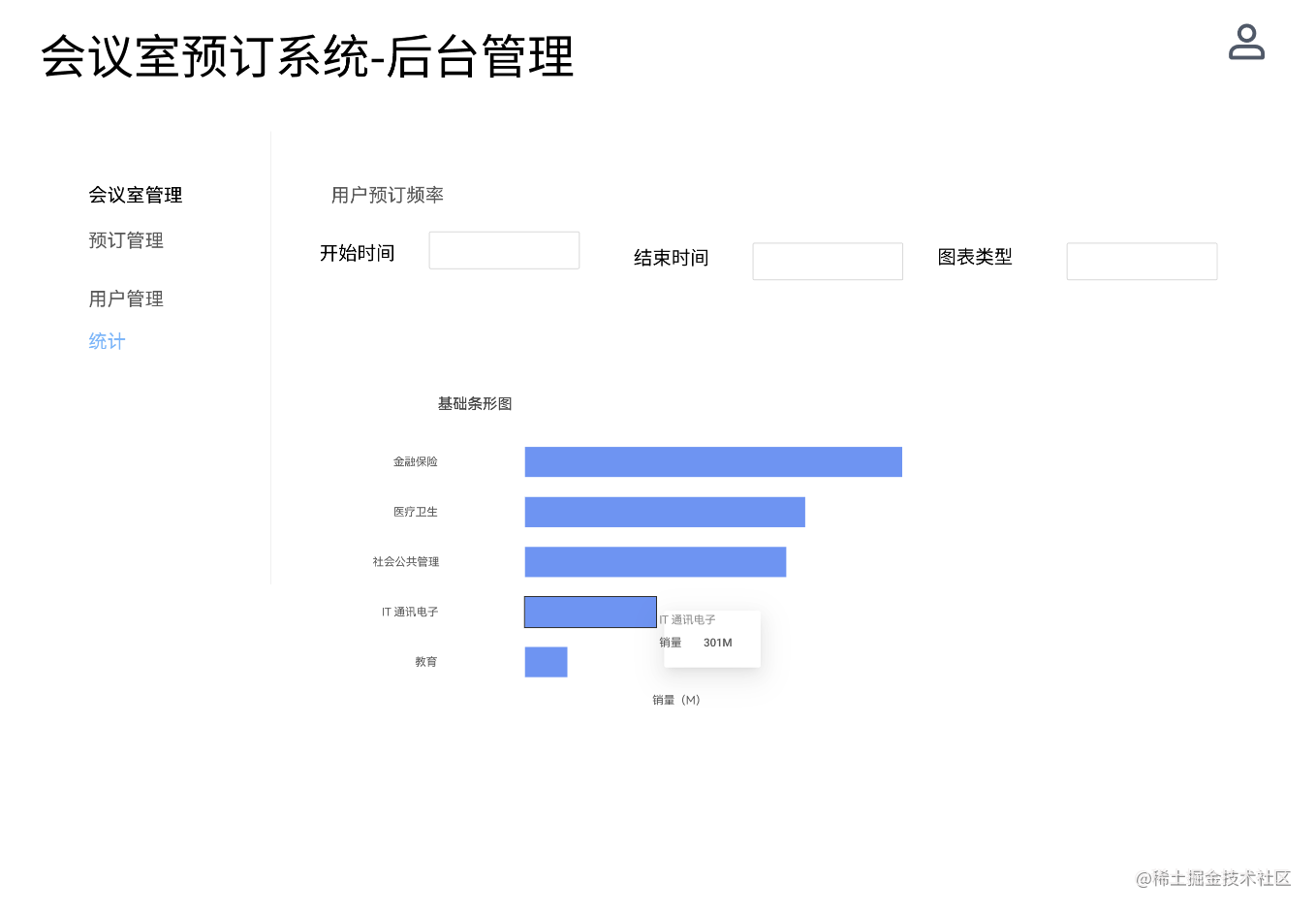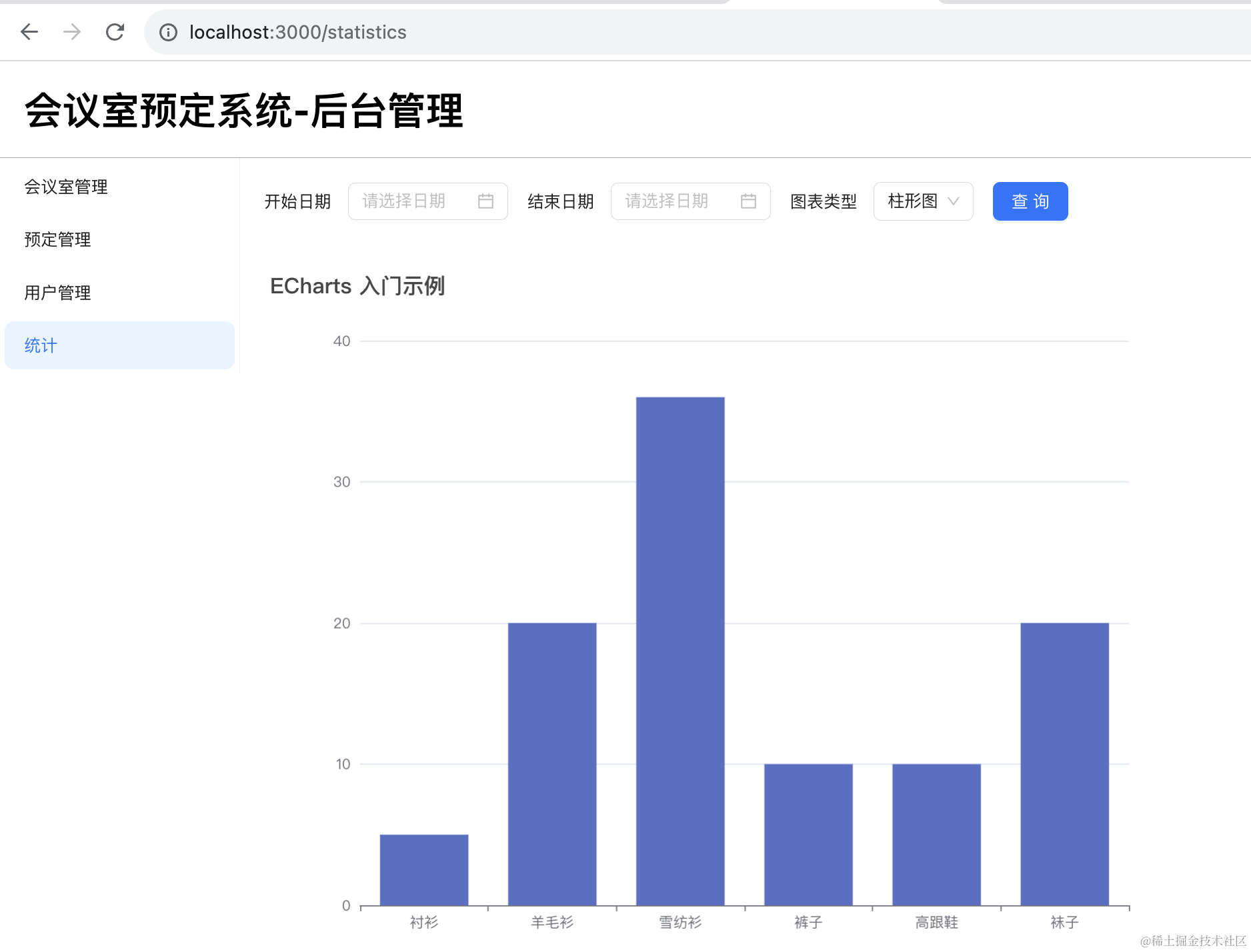 npm install echarts --save然后通过 useRef 拿到 dom 元素,再初始化下 echarts 的柱状图: