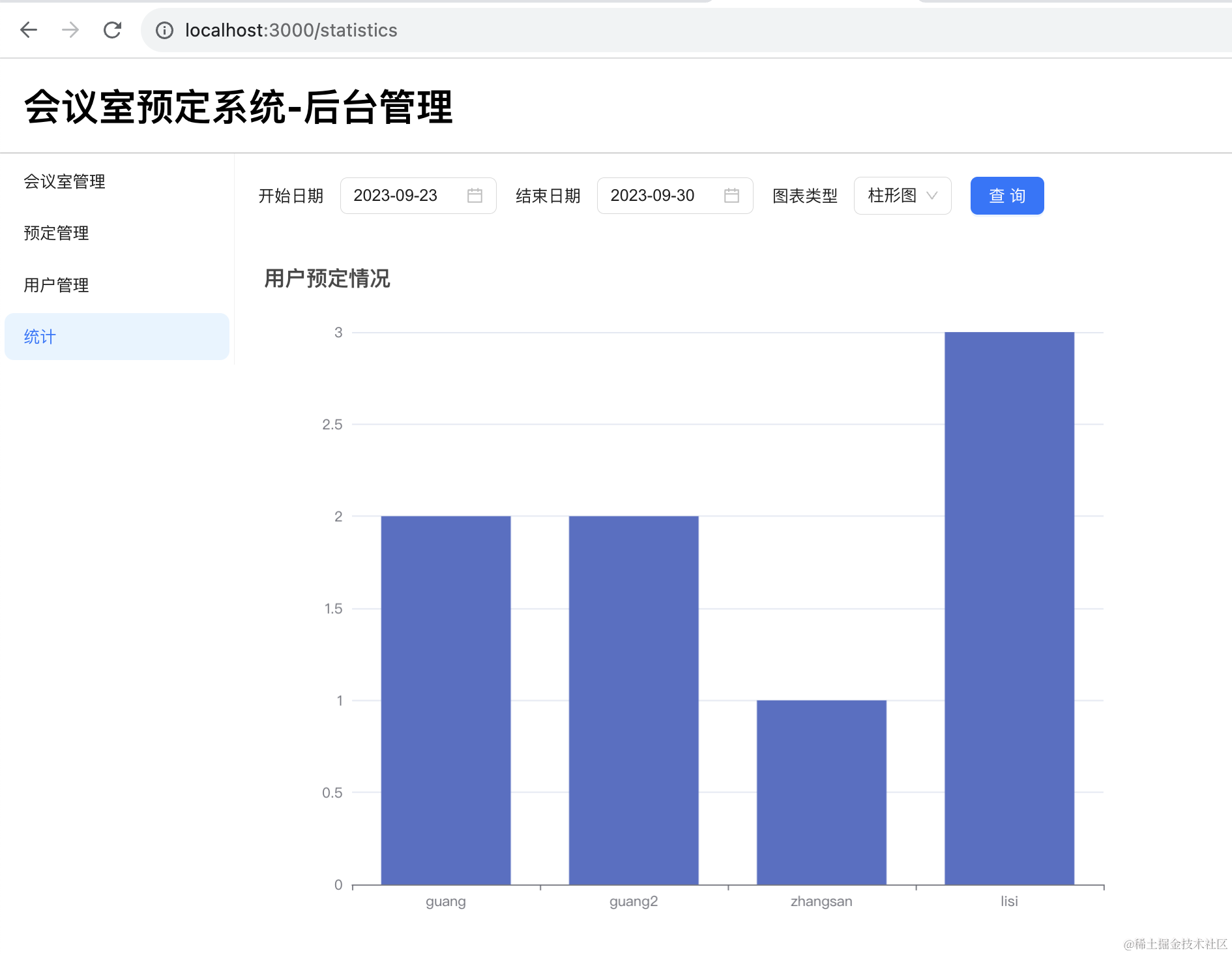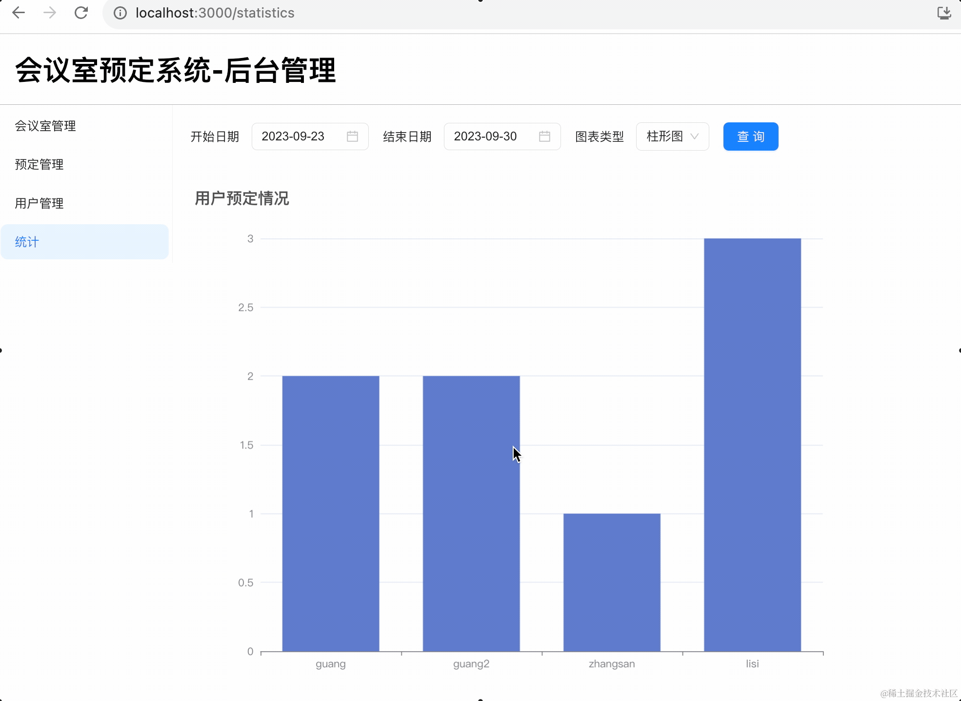 }这样,点击查询的时候就会根据返回的数据渲染柱形图:
