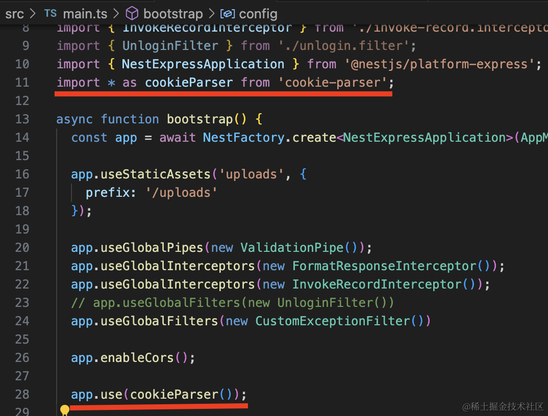 npm install --save-dev @types/cookie-parser在 main.ts 启用下: