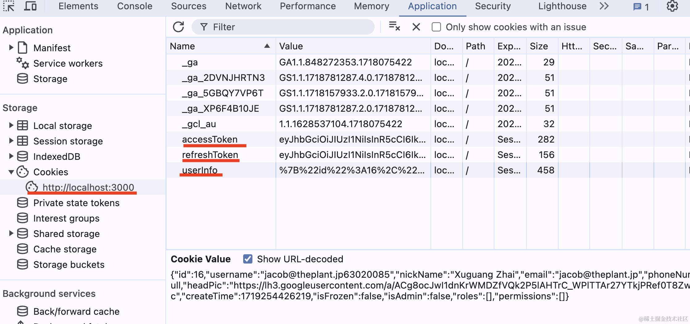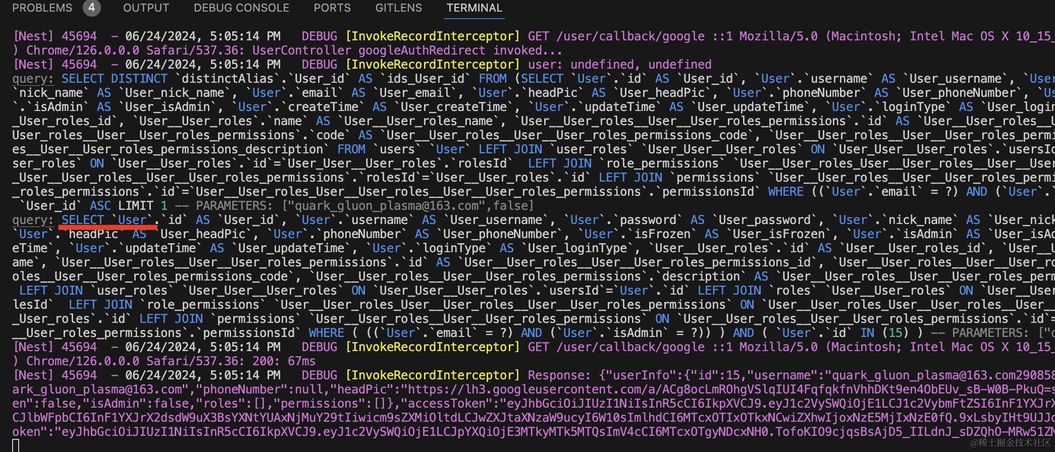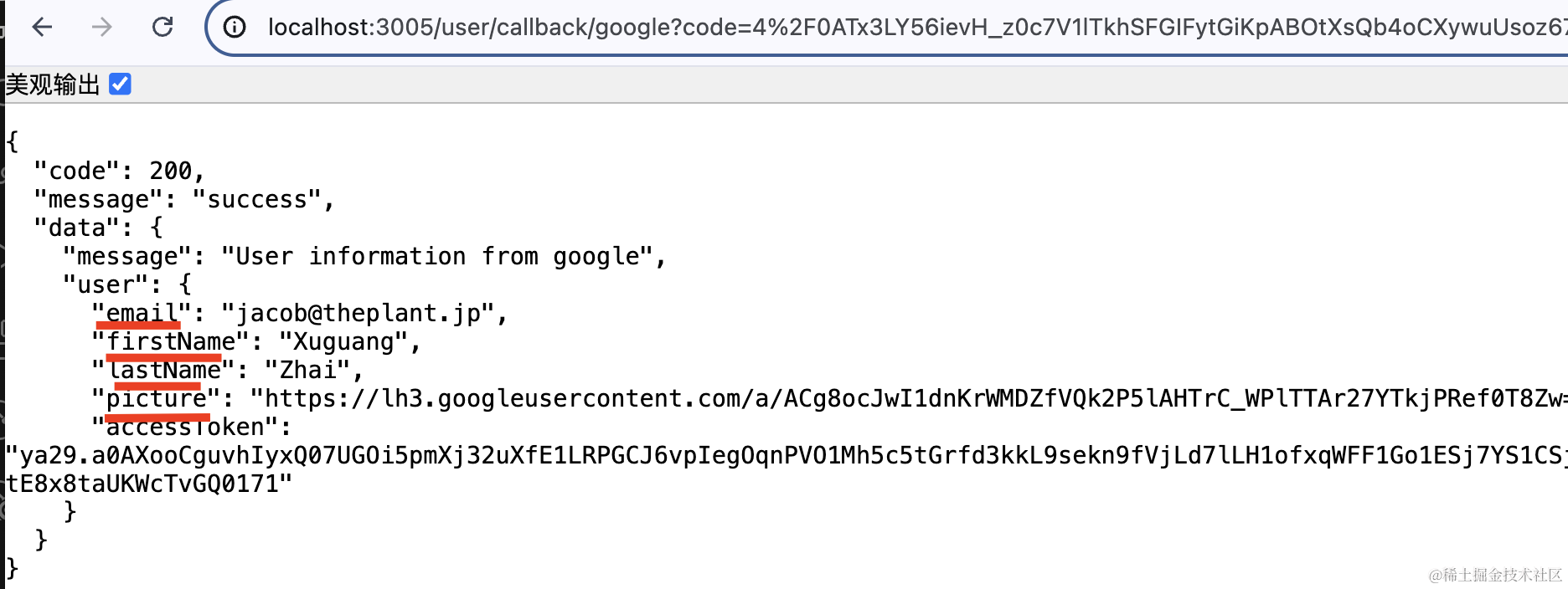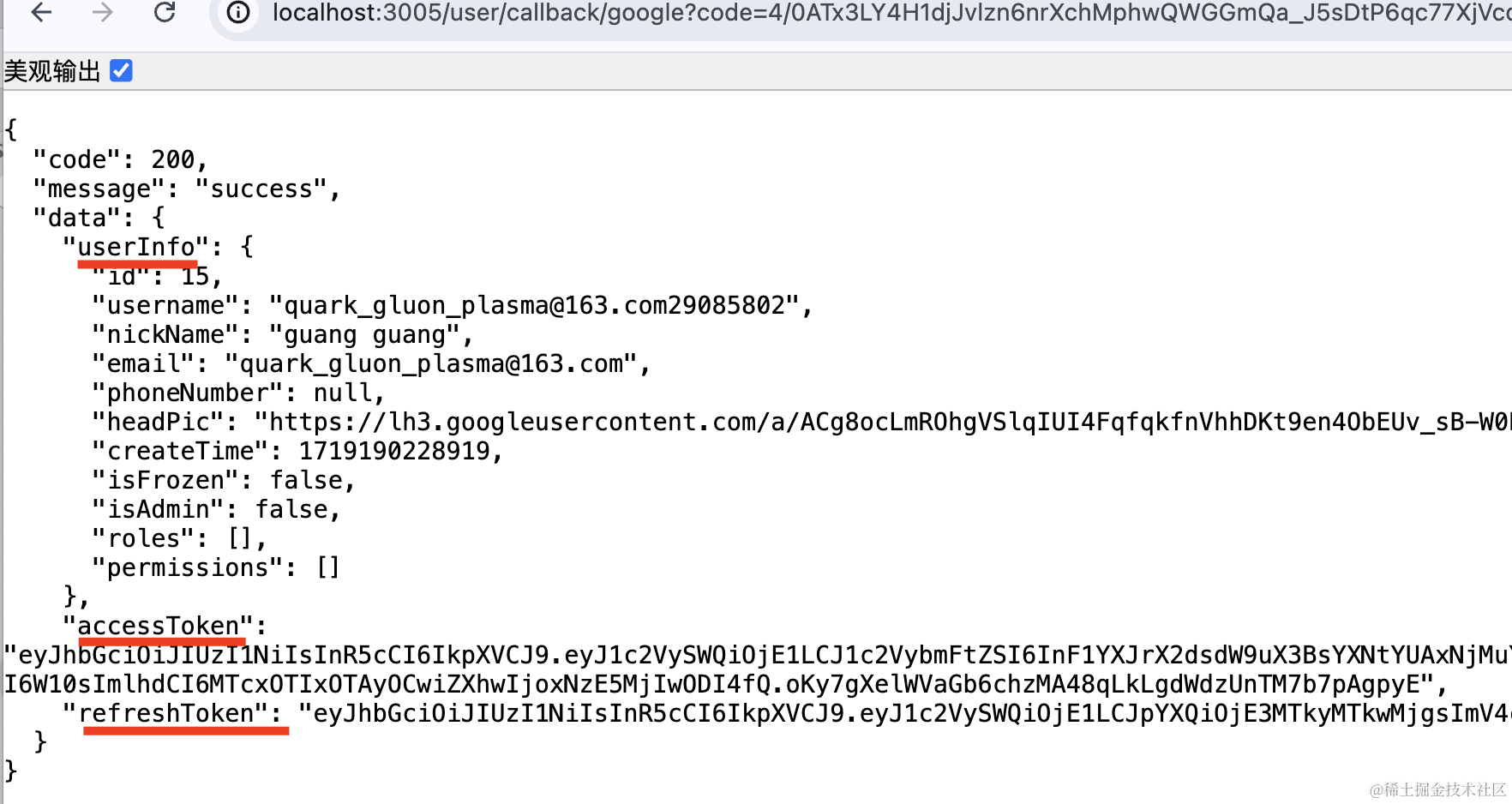 可以看到,google 授权之后,自动注册并返回了 token 信息,这样带上这个访问就是登录状态了: