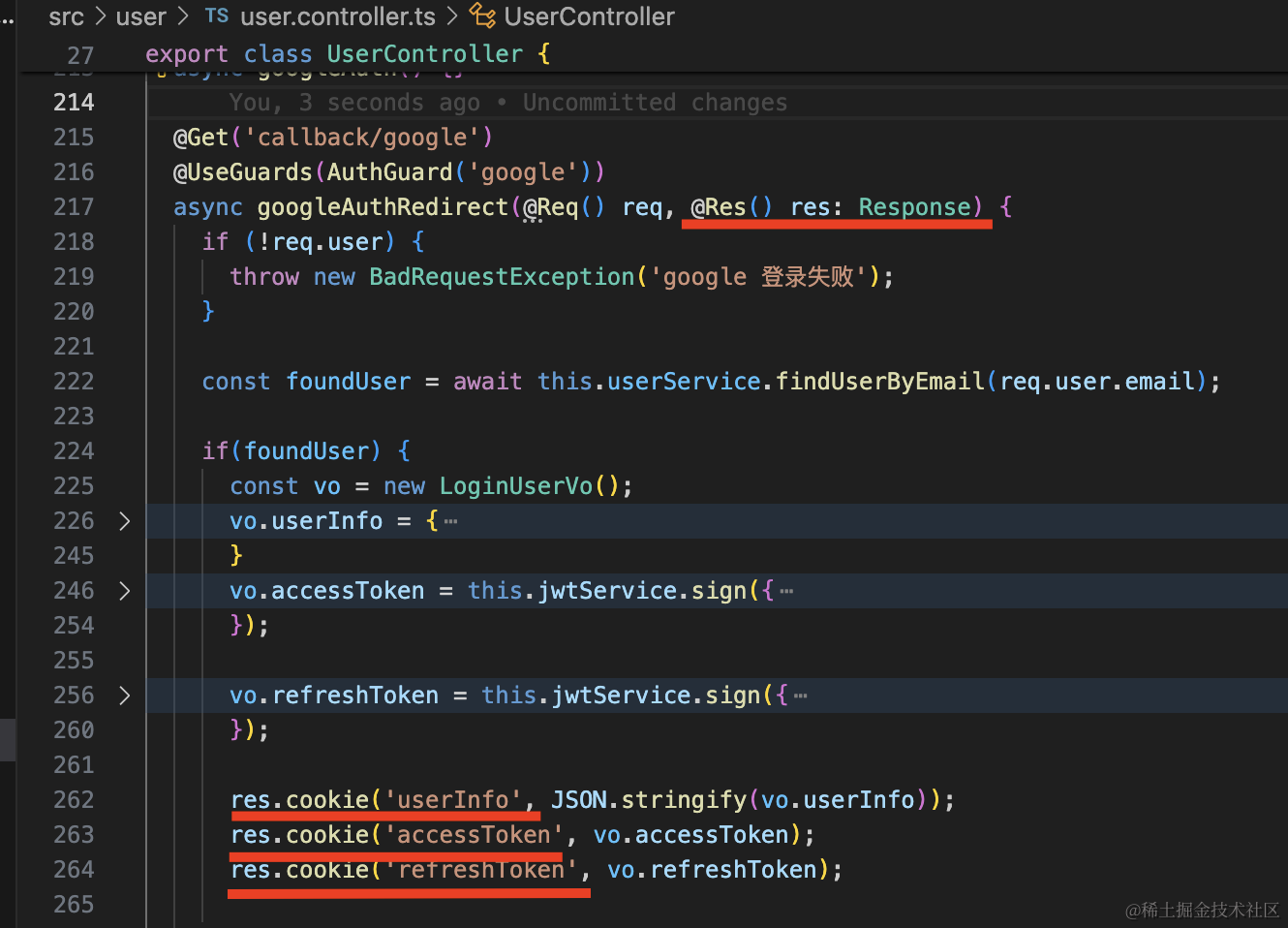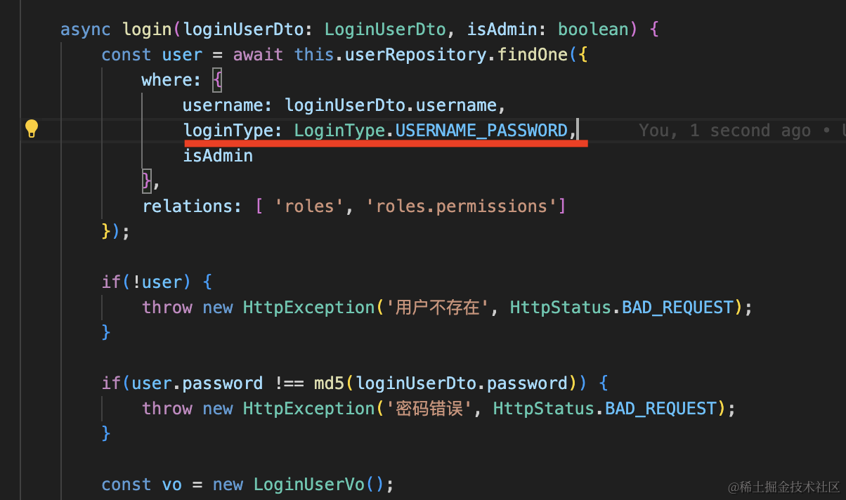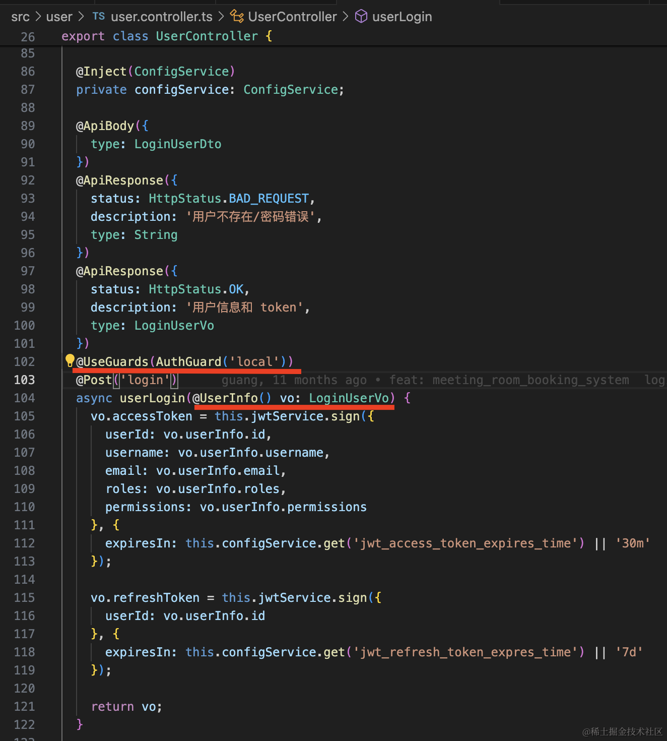 改成这样,用 AuthGuard(’local’) 来做处理即可,处理完从 reqeust.user 里拿 user 信息: