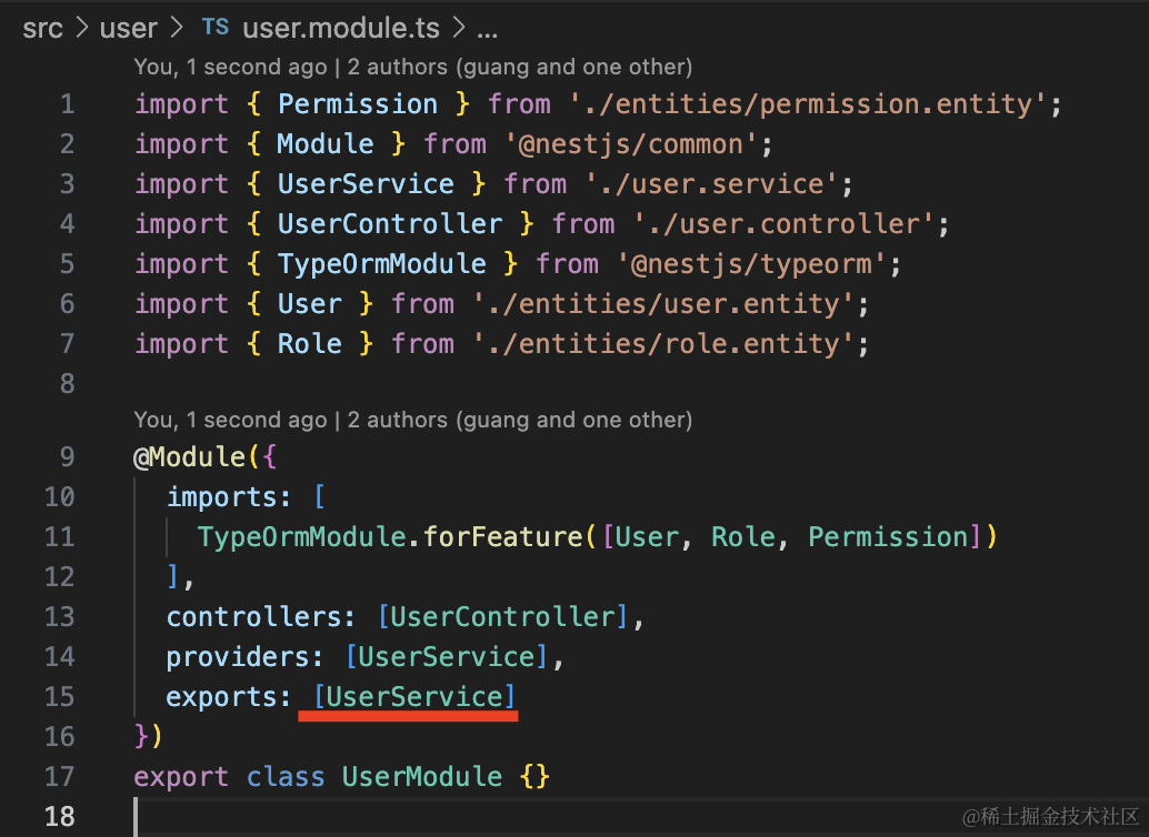 }这里需要用到 UserService,在 UserModule 导出一下: