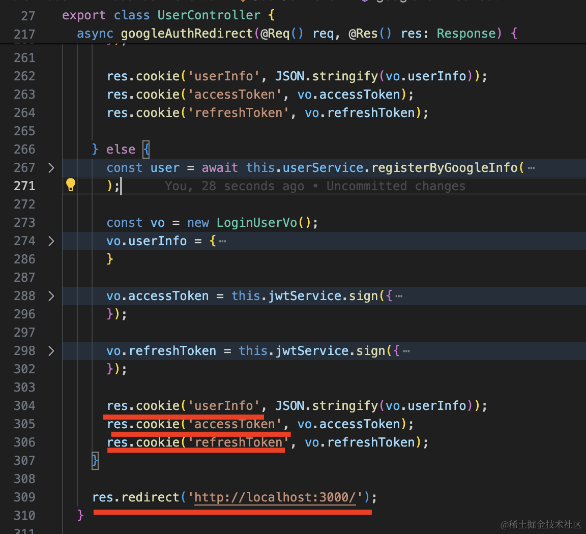 google 登录的 callback 里重定向到网站首页,然后通过 cookie 携带 userInfo、accessToken、refreshToken 等信息。