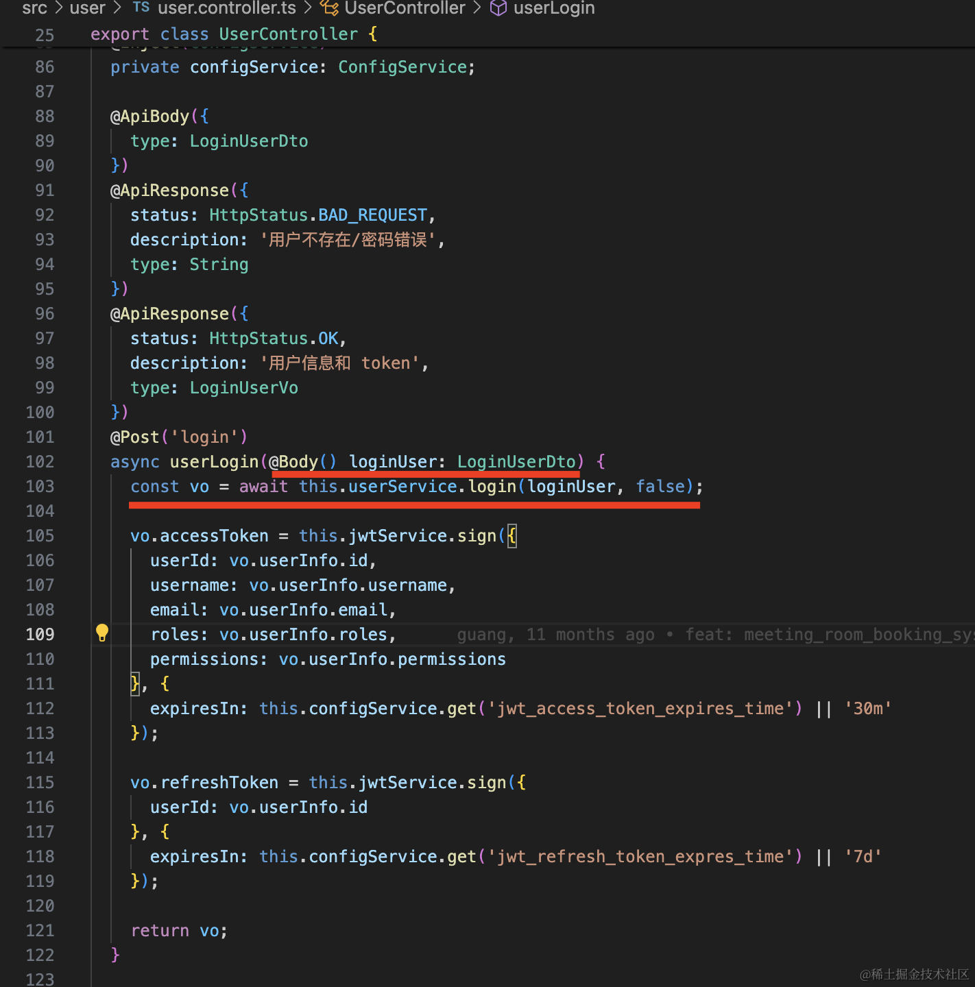 然后 user/login 里就不需要手动调用 userService 了: