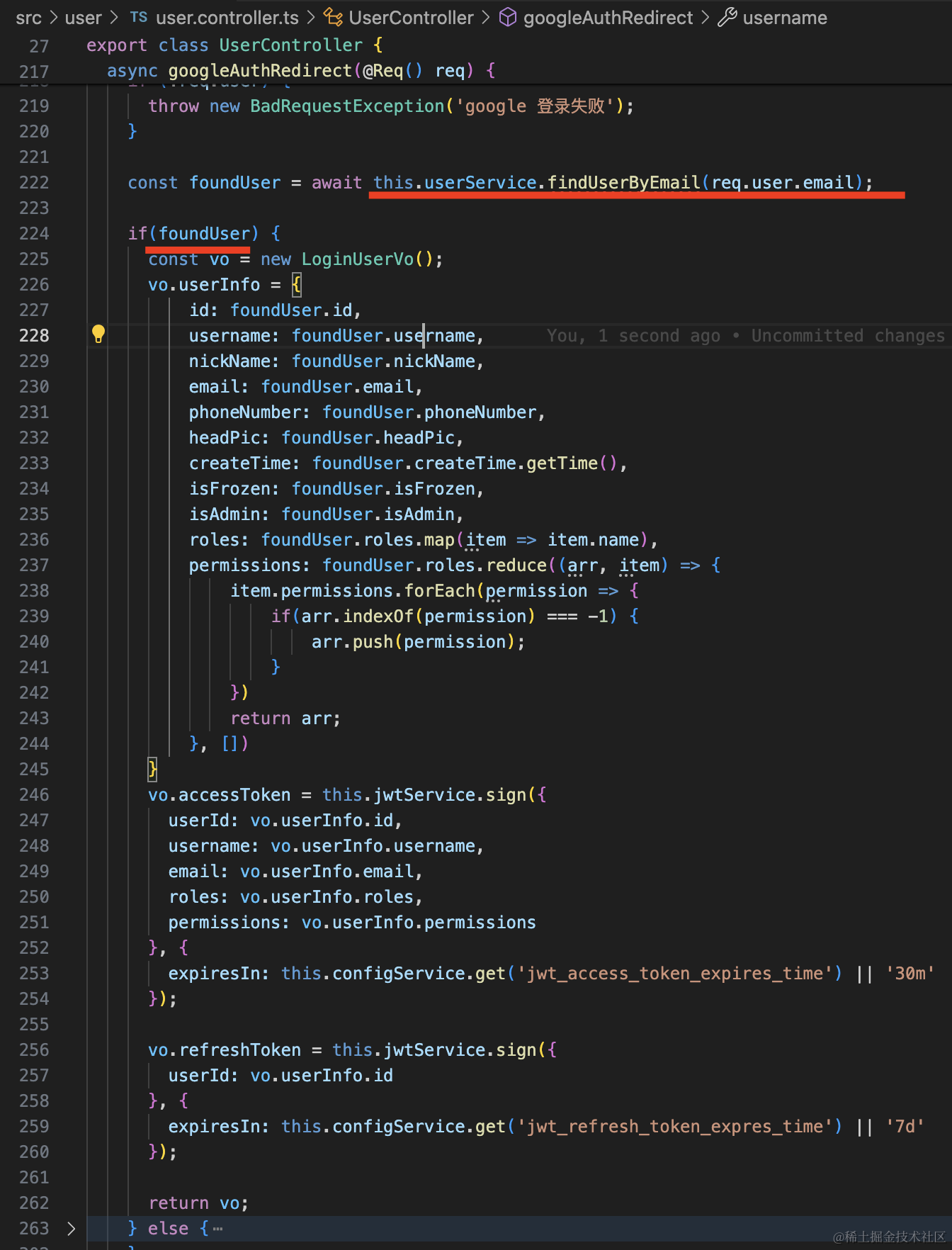 const foundUser = await this.userService.findUserByEmail(req.user.email);