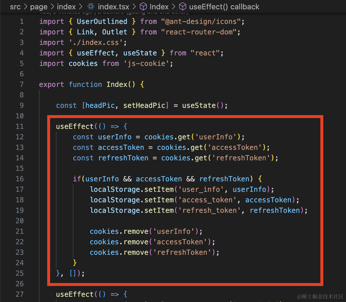}, []);如果 cookie 包含 userInfo、accessToken、refreshToken,就设置到 localStorage,然后把 cookie 删掉。