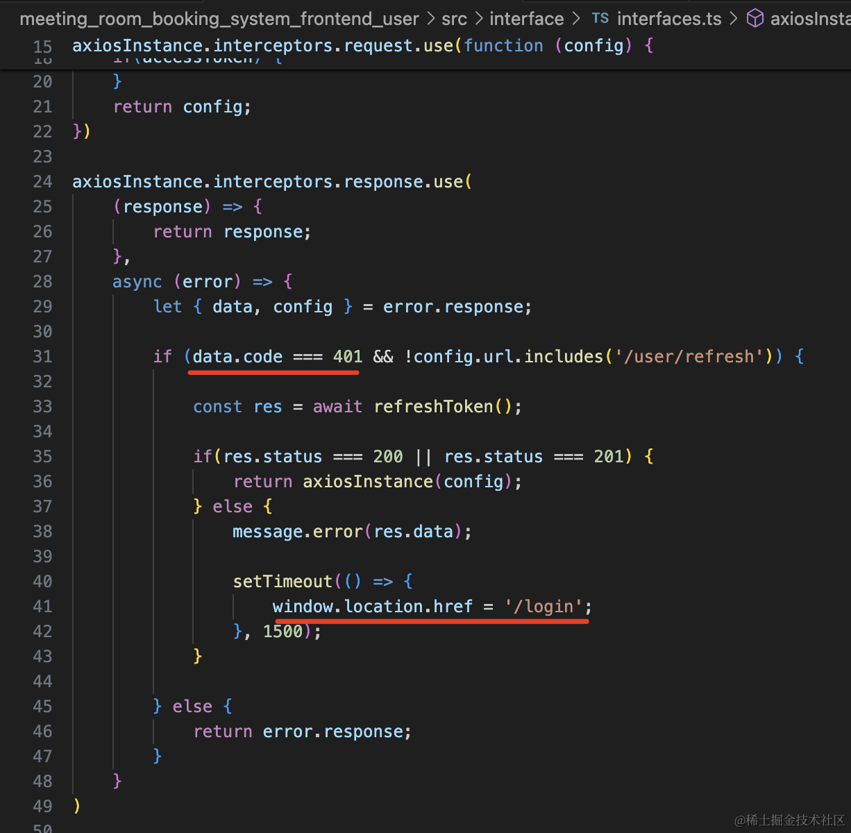 因为这些页面的接口需要需要登录,没登录访问会返回 401,我们在响应的拦截器里做了处理,如果返回 401 就跳转登录页: