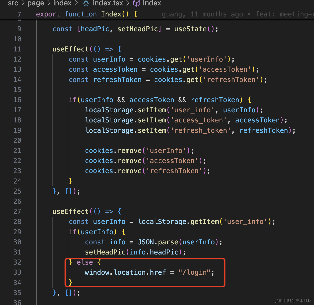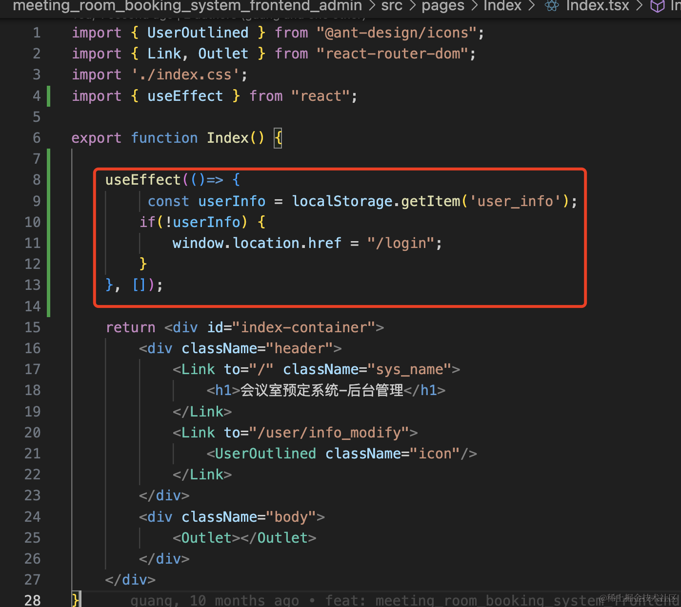 之前只是做了接口返回 401 的时候跳转登录页的逻辑,现在又补充了路由守卫,在 Index 组件里读取 localStorage 的值,如果没有 user_info 就跳转登录页面。