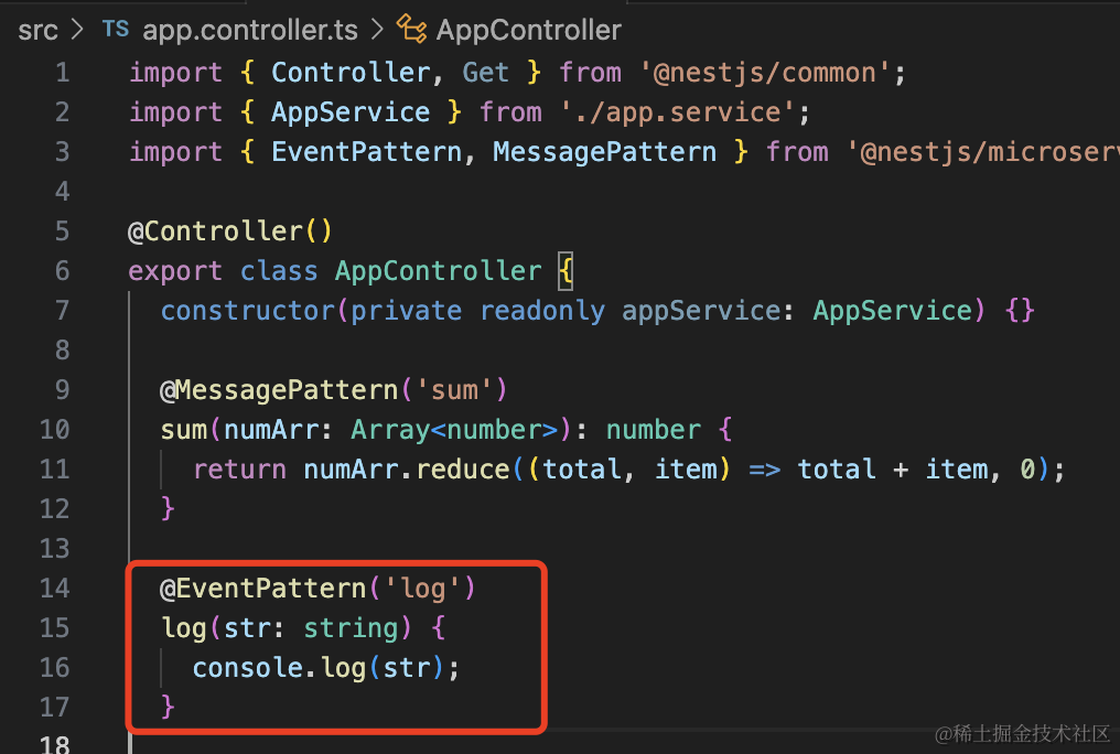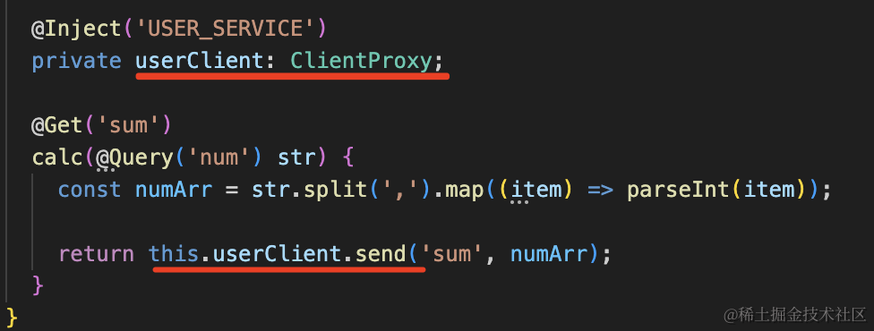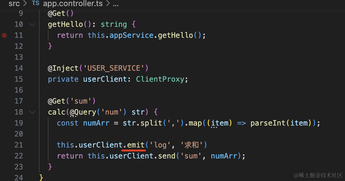 this.userClient.emit('log', '求和')注意,如果那边是 @MessagePattern 声明的方法,这边要用 send 方法调用。而 @EventPattern 声明的方法,这边要用 emit 方法调用。
