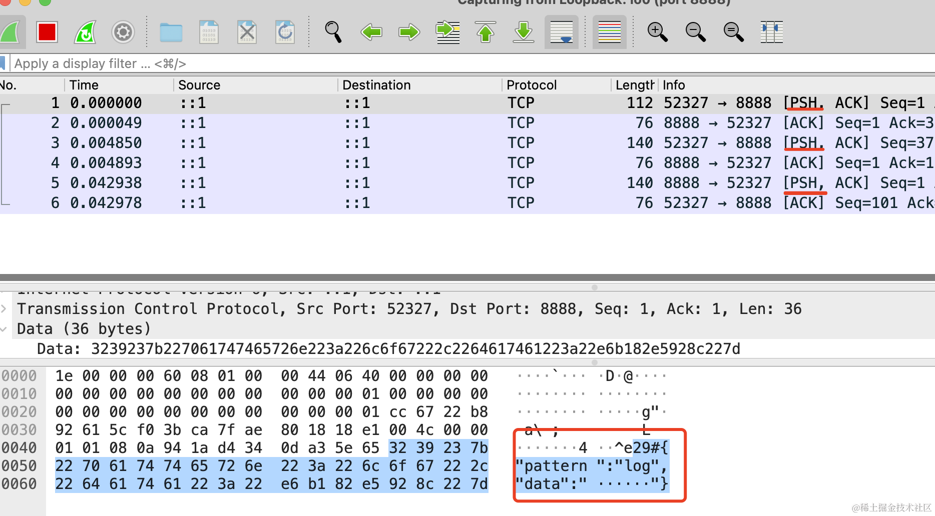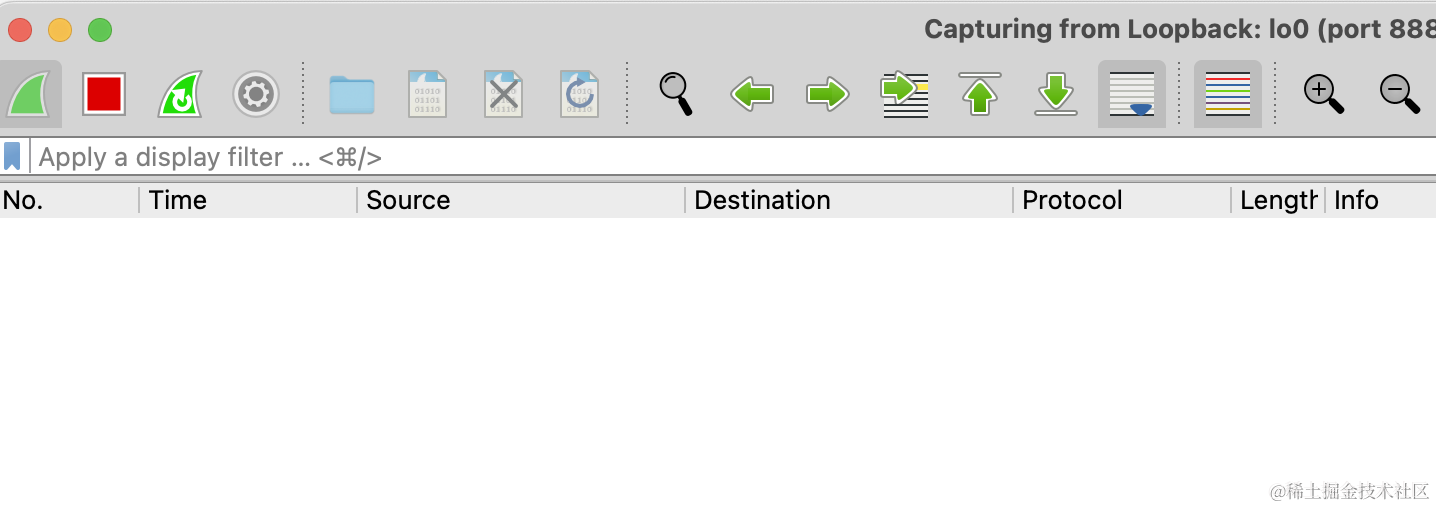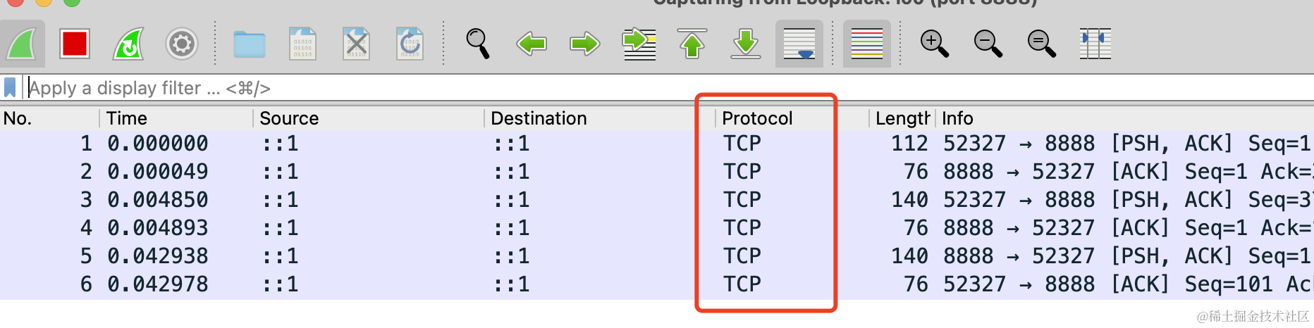 输入过滤器 port 8888,也就是过滤 8888 端口的数据包。