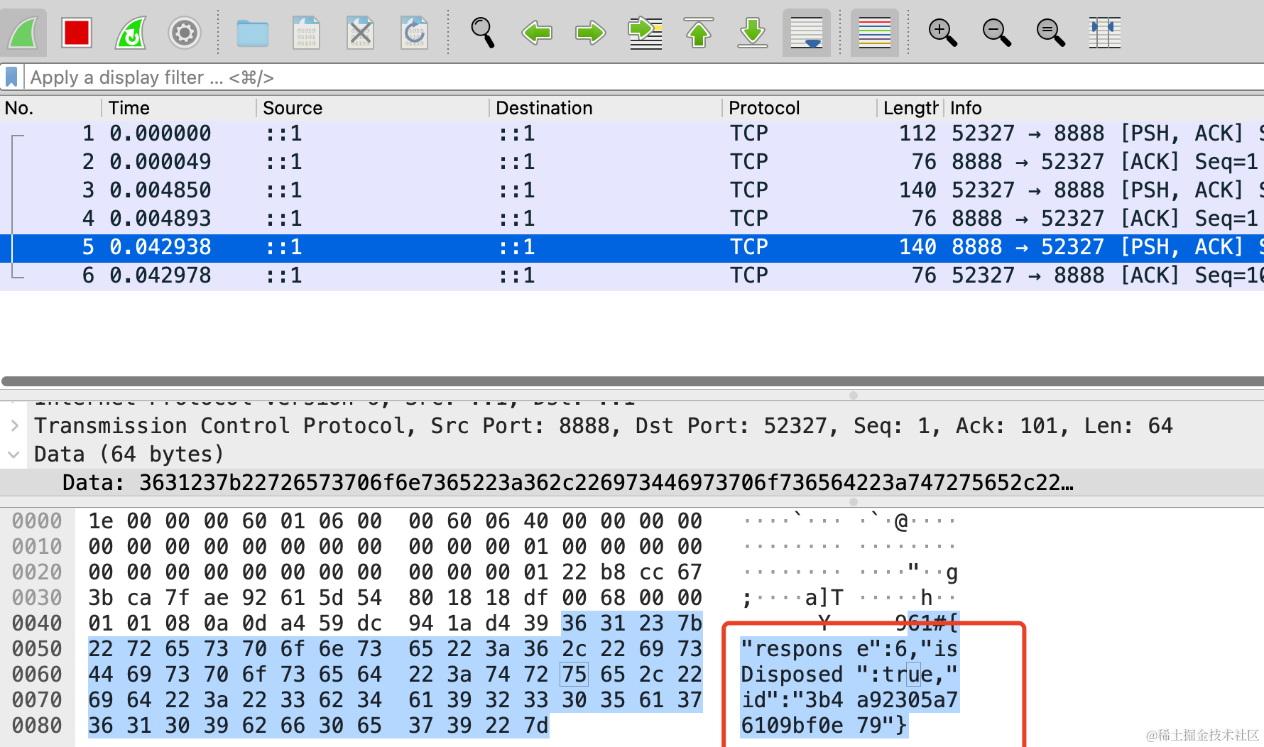 我们还通过 wireshark 抓包分析了 tcp 通信的内容,发现微服务之间的通信是基于 json 的。