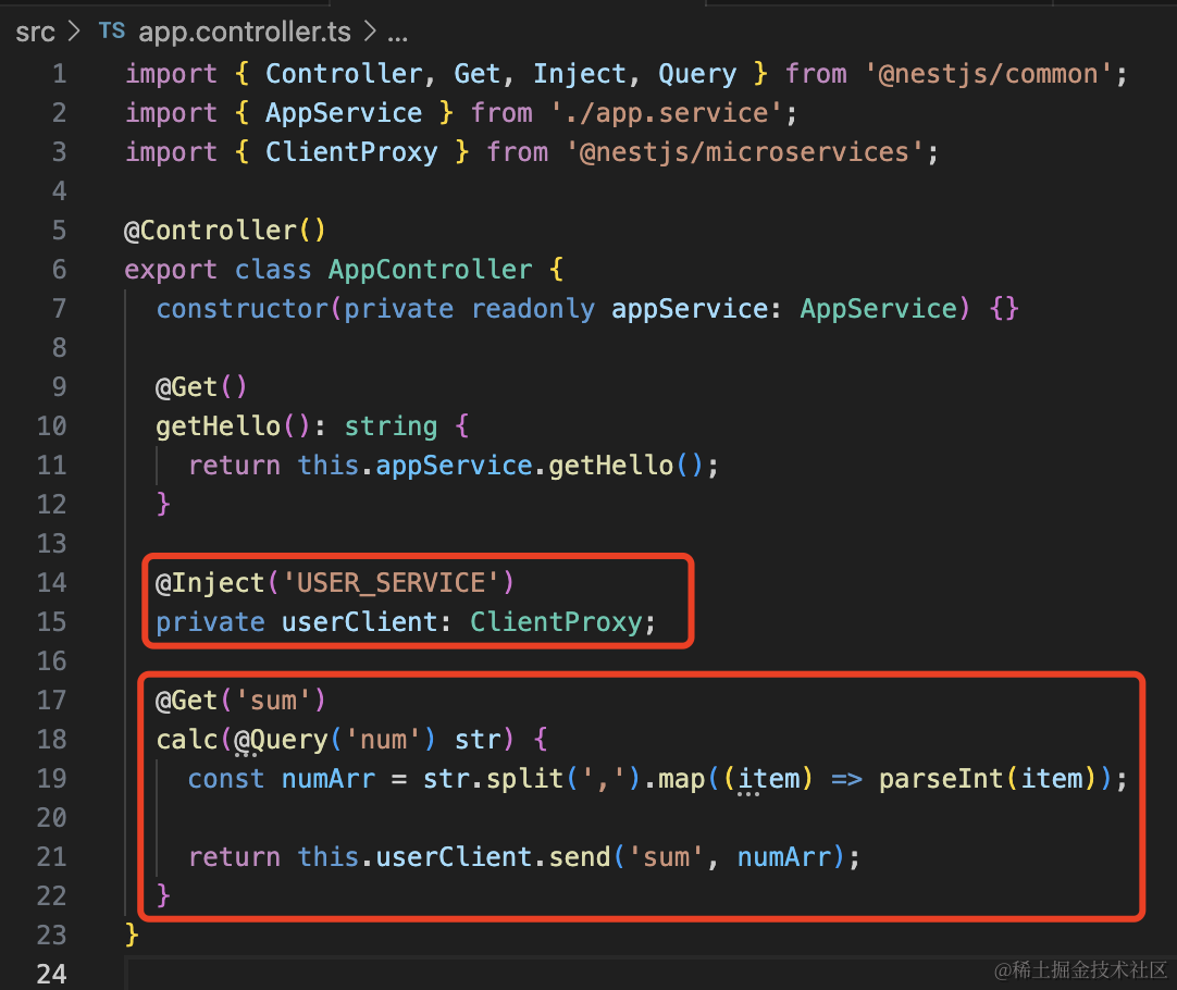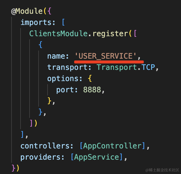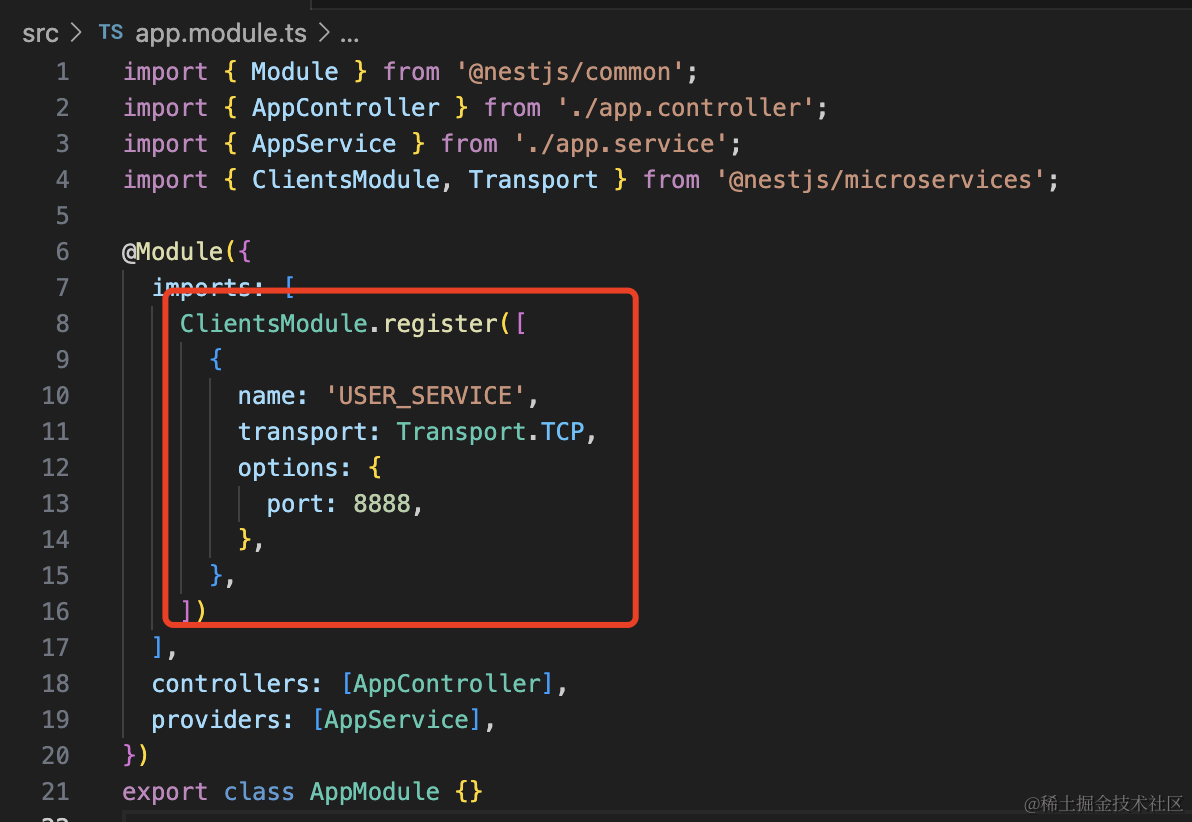 export class AppModule {}这里的 register 参数是一个数组,也就是说你有多个微服务的时候,都依次写在这里就行。