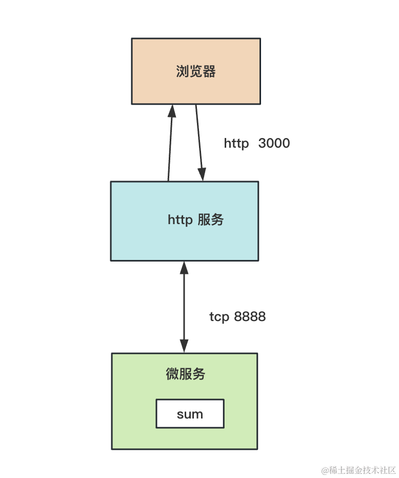 浏览器把 3、5、6 的参数传递给 http 服务,然后它给微服务发送消息,把参数带过去,微服务计算后返回了 14 给 http 服务,它再返回给浏览器: