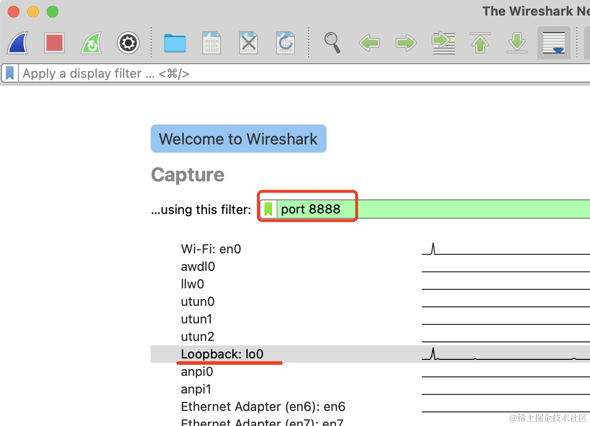 选择 loopback 这个网卡,本地回环地址,可以抓到 localhost 的包: